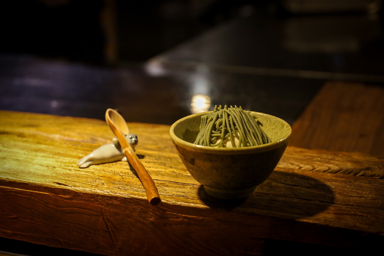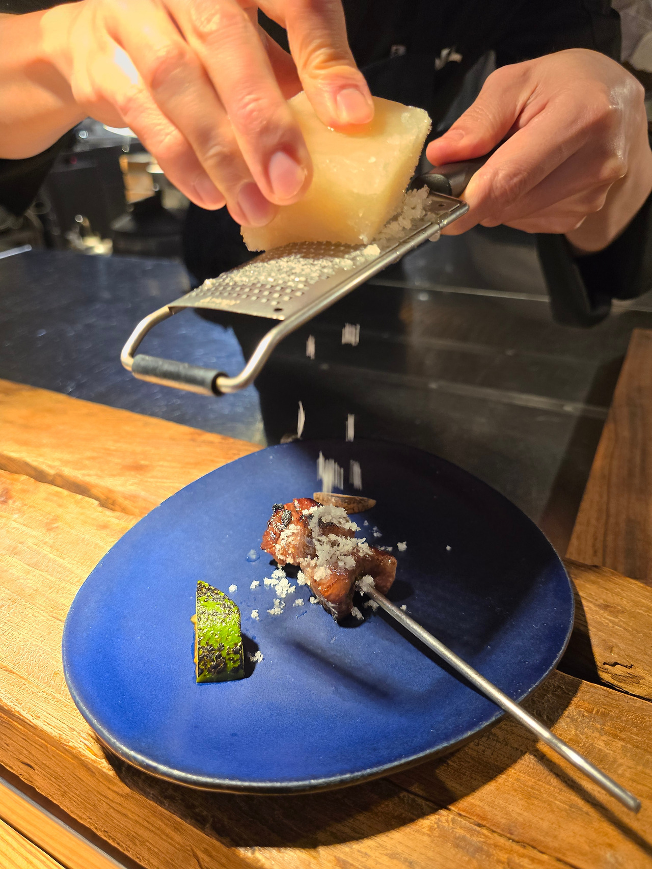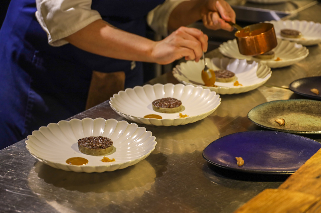 일곱 번째 나온 요리는 스토리텔링과 퍼포먼스가 드라마틱한 설야멱적이다. 눈 내리는 밤에 먹는 소고기구이라는 뜻이다. 눈 오는 밤 남몰래 별미를 즐겼던 평안도 양반의 음식으로 고기가 천천히 익도록 눈 속에 식혀가며 숯불에 굽는 레시피도 예술이지만, 잘 구운 한우 꼬치에 배와 갖가지 양념을 얼린 눈꽃 소스를 눈처럼 뿌리는 퍼포먼스는 시각적인 맛까지 예술이다.