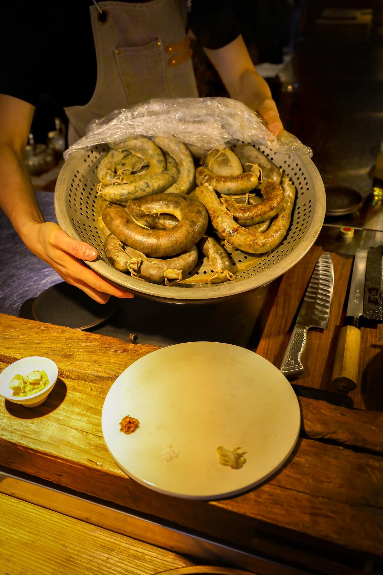 순대마다 찍어 먹는 양념도 모두 다르다. 채소 피순대는 퀄러티 최상의 육젓, 백순대는 말돈 소금, 게사니 순대는 수제 씨앗장, 양순대는 수제 새우젓튀김 소금, 아바이 순대는 멕시코 된장인 몰레 소스가 맛을 살려주고 모든 순대에는 개운한 명태식해가 잘 어울린다.