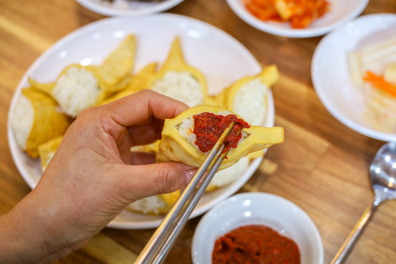 통일맛집의 주방은 새벽 5시부터 시작된다. 대표 메뉴인 두부밥의 재료인 두부를 부지런히 튀겨낸다. 도톰하고 노르스름하게 튀겨낸 두부를 반 갈라 그 안에 밥을 넣어 준다. 보기에는 심심해 보이지만, 한 입 먹어보면 두부 자체의 고소한 맛이 담백하고 깔끔하다. 두부밥에 곁들여 먹으라고 내어주는 빨간 양념을 발라 먹으면 먹는 속도가 저절로 빨라진다.