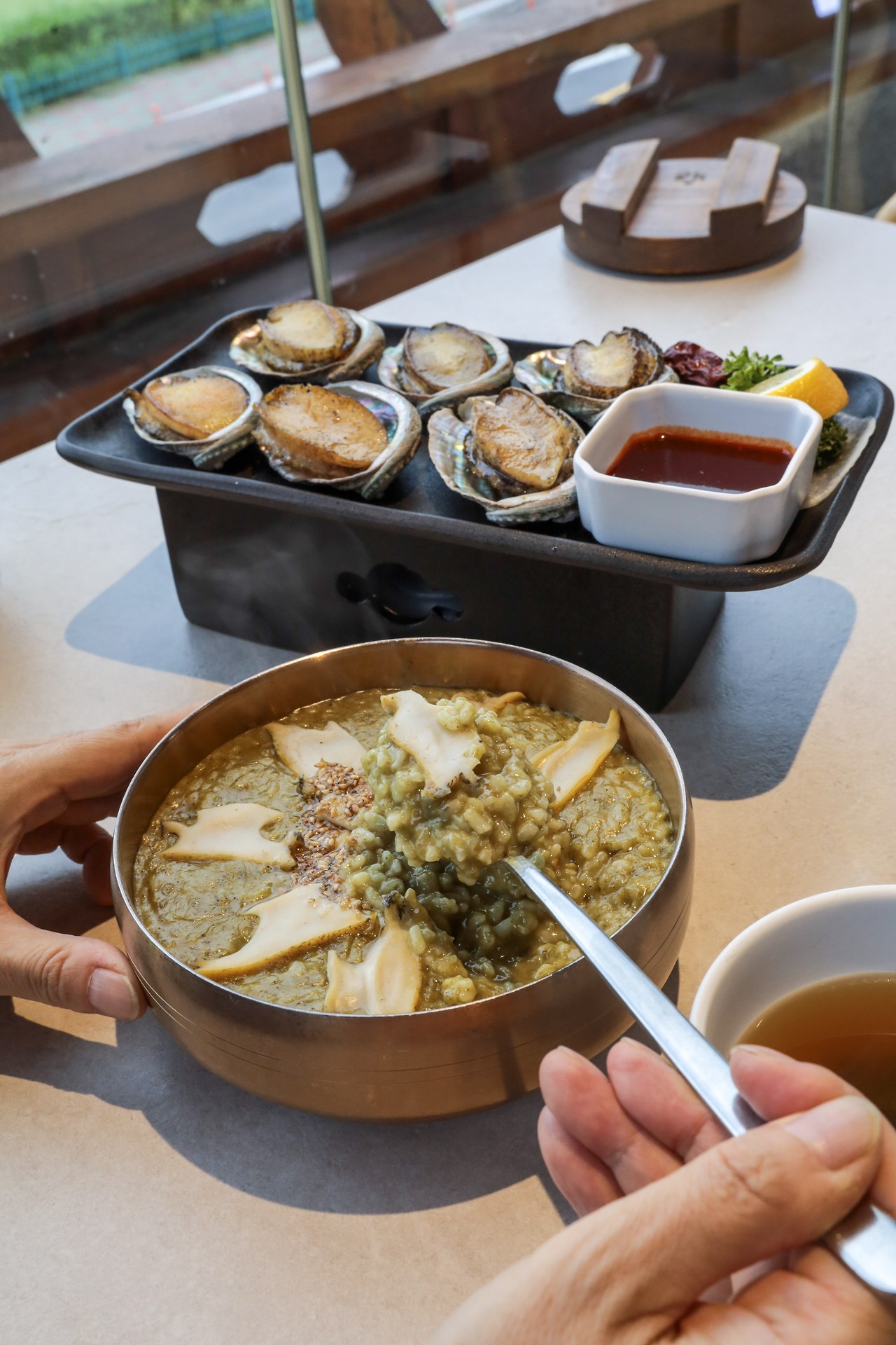 3인 스페셜 세트를 주문하면 전복솥밥과 불고기 솥밥, 전복죽과 전복찜이 한 상 가득 차려진다. 두툼한 전복을 초고추장에 찍어 먹는 맛이 쫀득하고 고소하다. 솥밥 세트보다 보양식 세트라는 느낌이 들 만큼 푸짐하다.