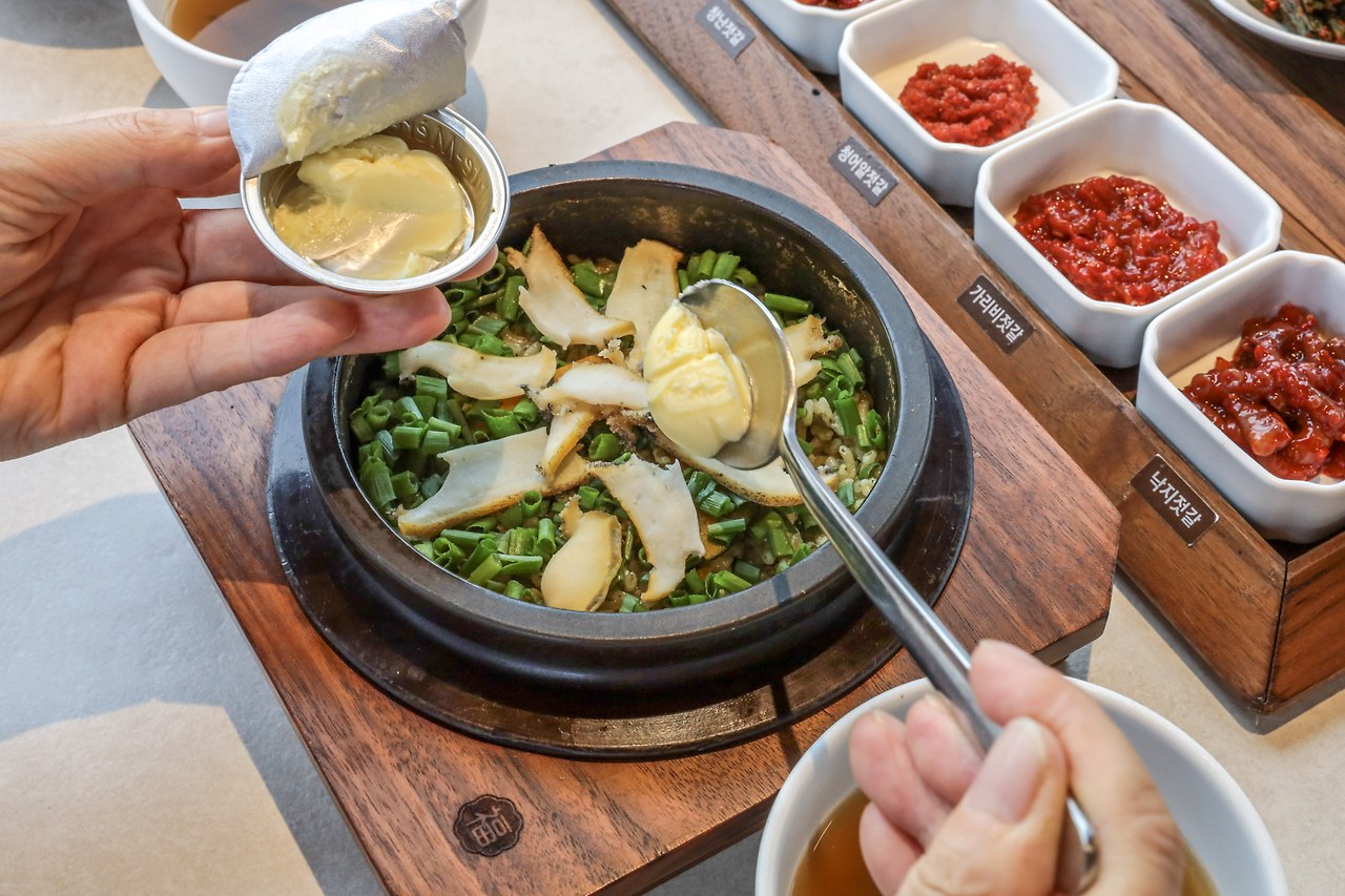 전복솥밥은 MZ들이 좋아하는 밥상이다. 전복 솥밥에 고소한 이즈니 버터를 넣어 비벼서 먹으면 상상했던 그 이상의 풍미를 경험하게 된다. 솥밥 앞에 놓인 청어알젓갈, 가리비젓갈, 낙지젓갈, 창난젓갈의 달콤 짭조름한 활약이 시작되는 순간이다.