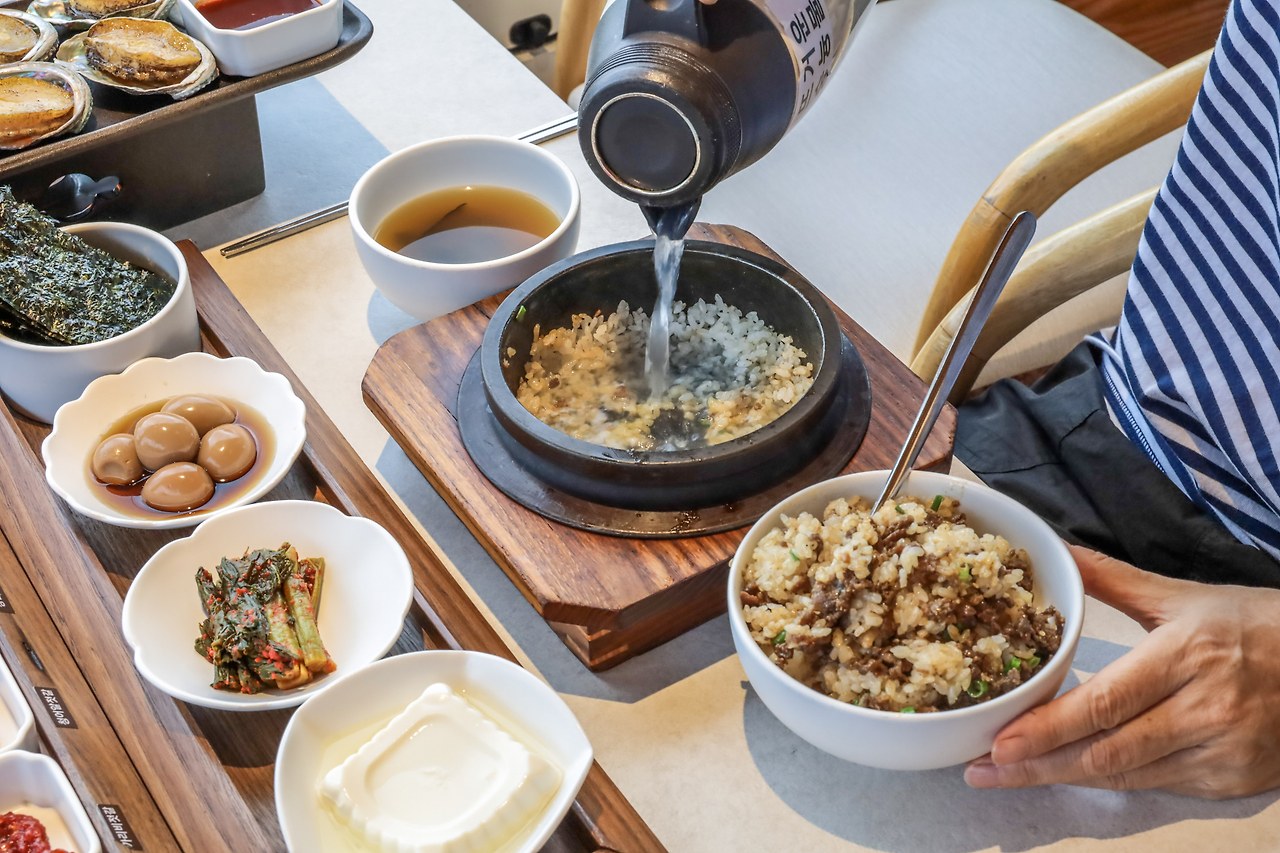 버터를 넣어 골고루 잘 섞은 전복솥밥은 그릇에 덜어놓고 뜨거운 물을 부어 누룽지를 즐길 수 있다. 버터와 전복의 향보다는 누룽지의 고소한 눌은 맛이 우러나서 따끈하게 소화제 혹은 디저트처럼 특별하게 즐길 수 있어 반갑다.