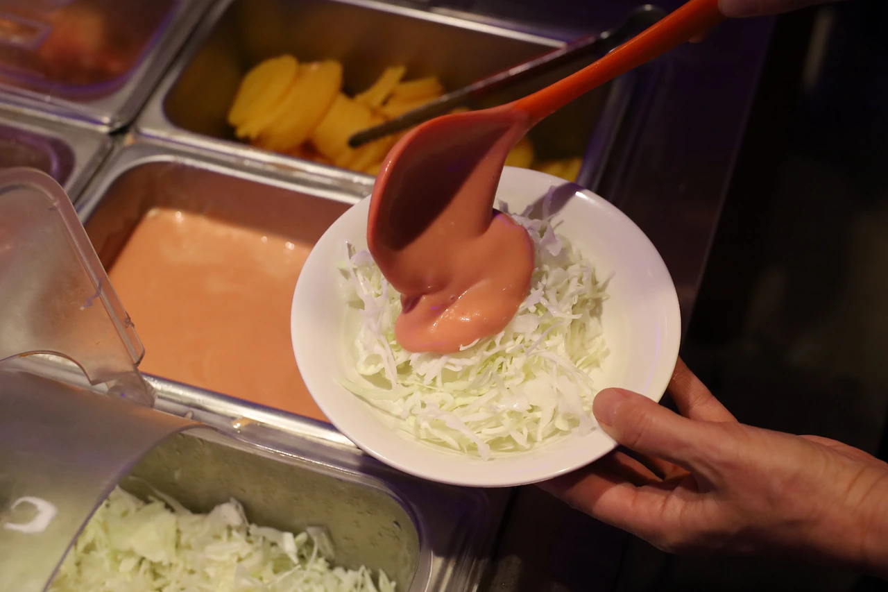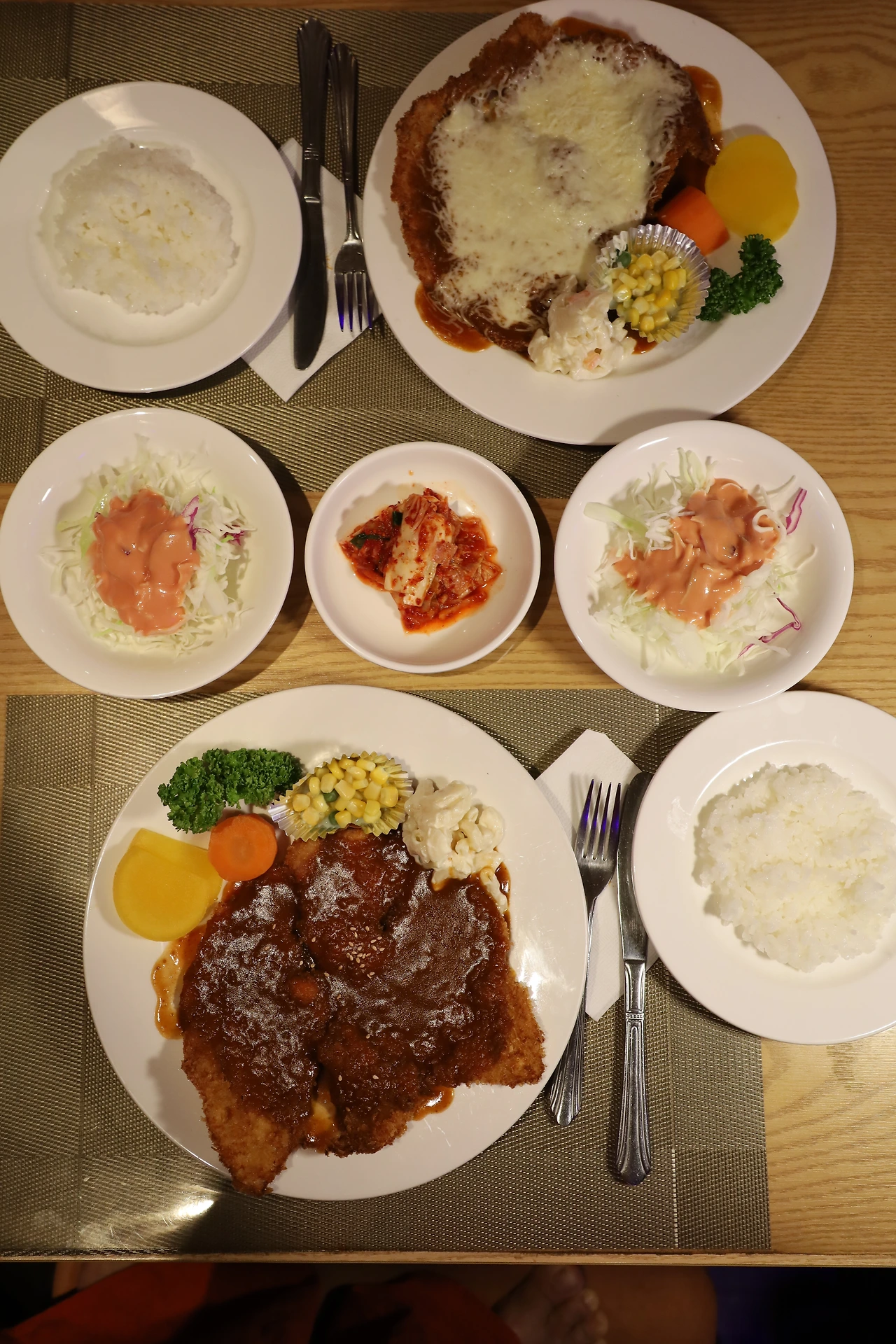 옛날 돈가스의 미덕은 부드러운 스프 말고도 돈가스 접시에 마카로니 샐러드와 당근, 옥수수와 새콤한 단무지가 푸짐하게 올려진다. 상큼한 토마토소스가 올라간 양배추 샐러드 외에 매콤한 김치와 밥까지 나오니 큼직한 돈가스와 곁들이면 포만감에 만족도는 더 올라간다.