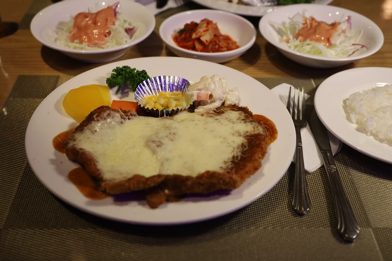 지금은 사람들이 가장 좋아하는 돈가스와 함박스테이크 등으로 메뉴를 줄였는데, 치즈가 올라간 눈꽃치즈 돈가스는 MZ들의 입맛을 사로잡았다. 얇고 바삭한 돈가스 위에 눈꽃처럼 하얀 모짜렐라 치즈를 소복하게 쌓아주니 큼직하게 썰어서 한 입 먹으면 쫄깃한 치즈가 일품이다.