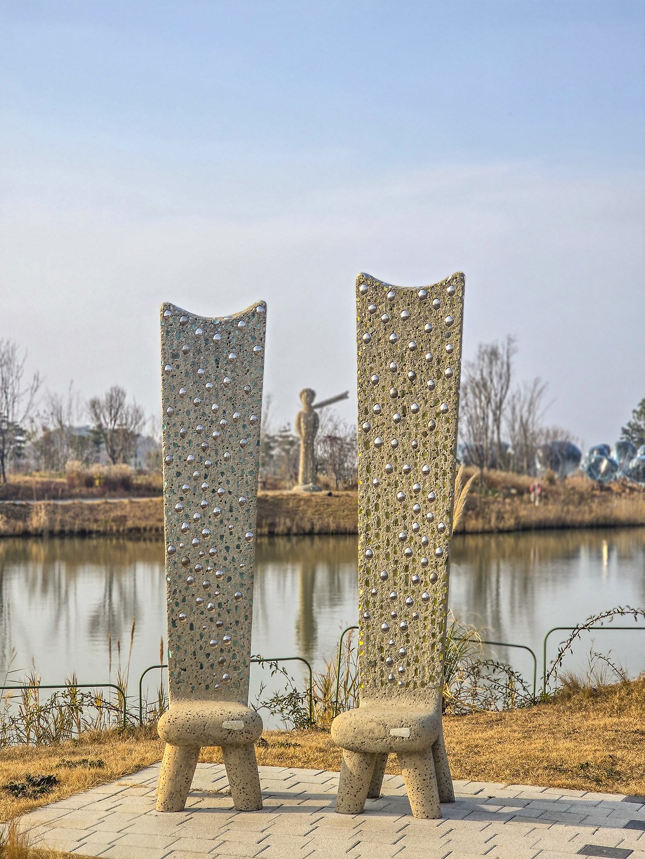 스텐레이스 수저를 엎어서 붙여 만든 반짝반짝 키다리 의자는 인증숏 찍기에 알맞다. 든든하게 뒤를 지켜주는 어린 왕자가 있어 외롭지 않게 인증숏을 찍을 수 있다. 잔잔한 호수와 어린 왕자가 배경이 되는 멋진 풍경이다.