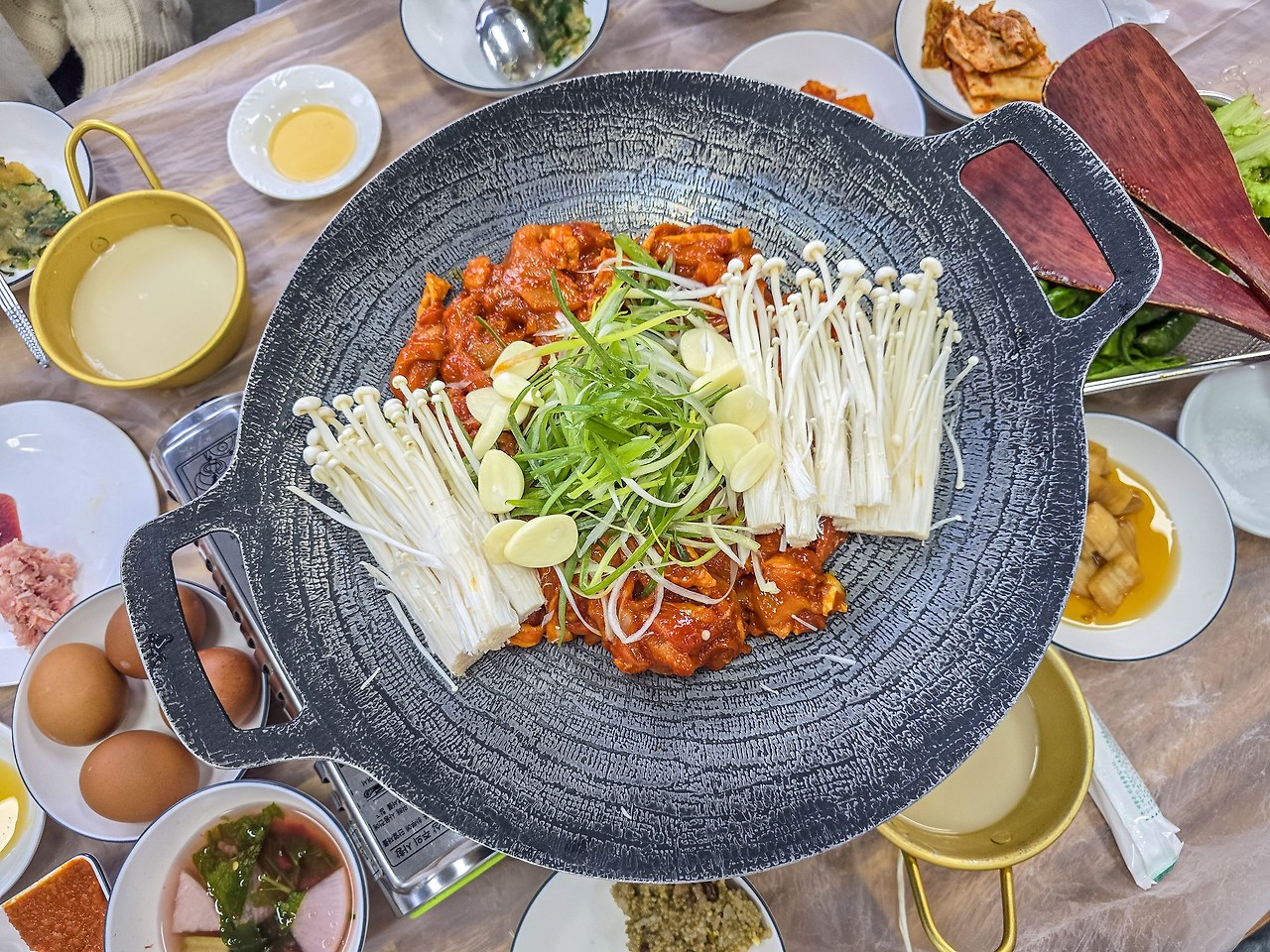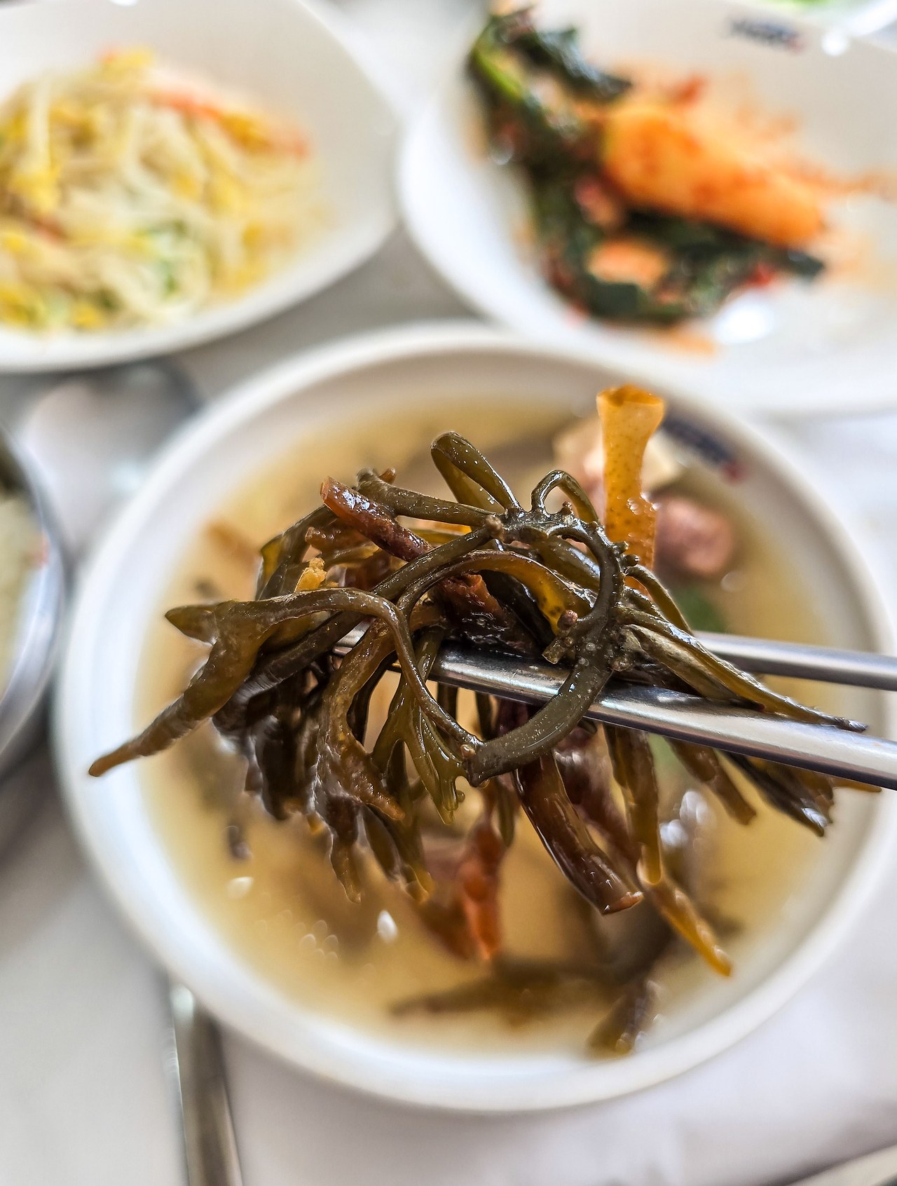 소고기가 들어간 미역국을 상상해도 그만이지만, 뜸북의 톡톡 씹히는 식감은 미역보다 명랑하고 신박한 맛이다. 갈빗국에 들어간 갈비는 튼실하고 국물은 진한 갈비탕 국물맛이다. 뜸북의 시원한 맛도 좋다. 매콤 달콤한 꽃게무침과 낙지호롱이도 빼놓을 수 없다. 싱싱한 산 낙지회에 이어 쫀득한 낙지호롱이도 입맛을 사로잡는다.