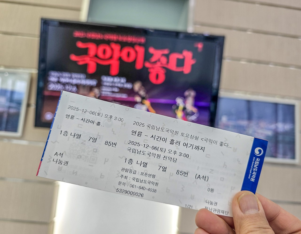 국립남도국악원의 토요상설공연 '국악이 좋다' 공연은 무료 관람이다. 티켓팅으로 좌석에 앉고 공연은 80분간 이어진다. 공연은 사진촬영이 제한되어 찍을 수 없지만, 국내최고의 공연이라고 할 만큼 멋진 국악 공연이다.