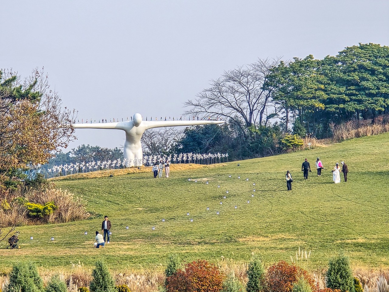 멀리 산이정원 하늘마루에 설치된 유영호 작가의 '브리지 오브 휴먼' 조형물이 보인다. 오늘의 신부 신랑이 사진촬영을 하고 있다. 산이정원 곳곳에는 야구를 하는 가족과 데이트 중인 연인들이 보인다. 산이정원은 규모뿐 아니라 여유롭고 편안한 분위기로 누구나 포용하는 큰 정원의 느낌이다. 봄 여름 가을에 다시 가고 싶다.