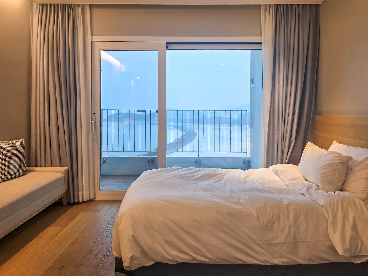 바스락거리는 침구가 좋았다. 창밖으로 보이는 바다가 있어 겨울에도 따뜻하게 풍광을 즐길 수 있는 숙소다.