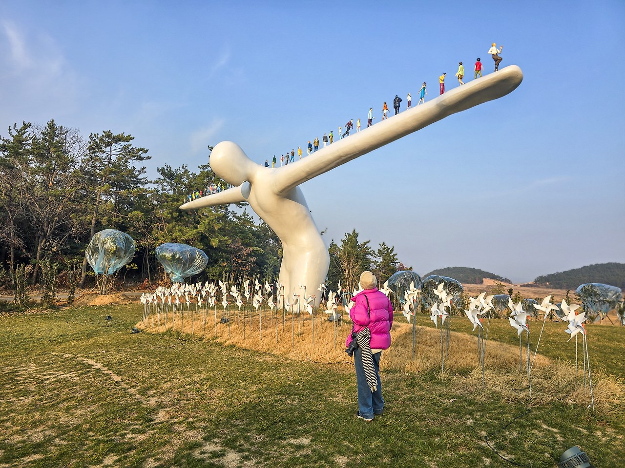 '브리지 오브 휴먼'은 몸을 숙여 스스로 다리 역할을 하는 거인의 양팔 위에 42명의 인간 군상이 걸어가는 풍경을 보여준다. 그리팅맨으로 유명한 유영호 작가의 작품이라 그런지 친근한 느낌이 들어서 인증숏을 남겼다.