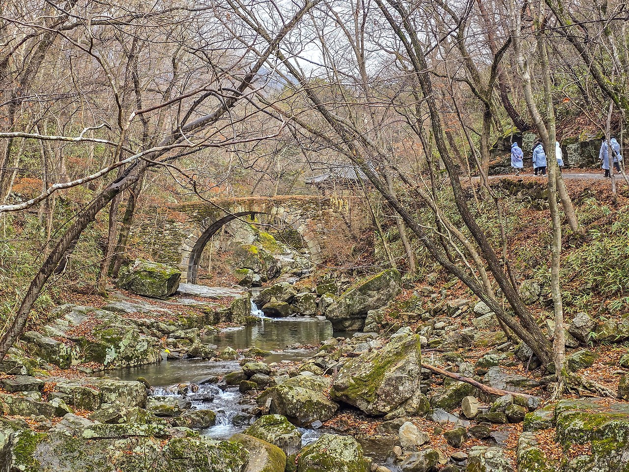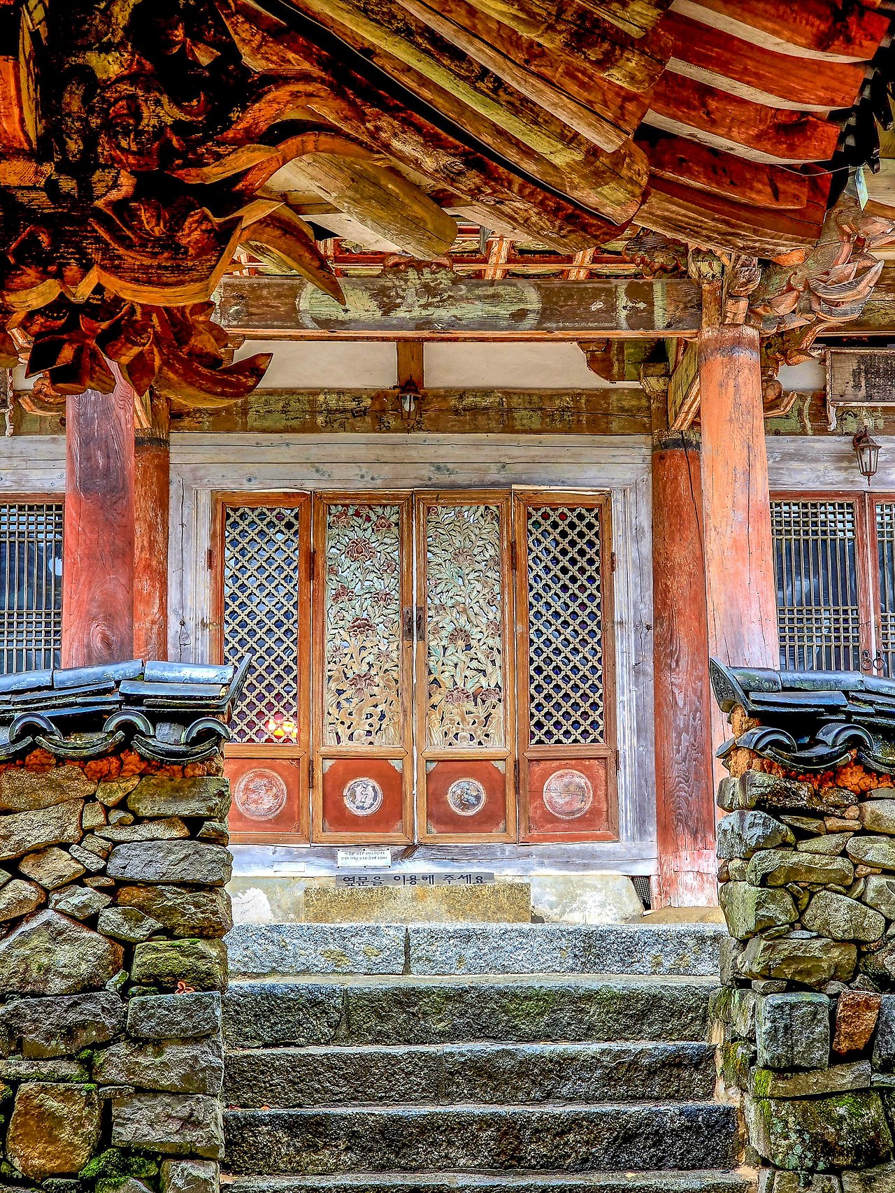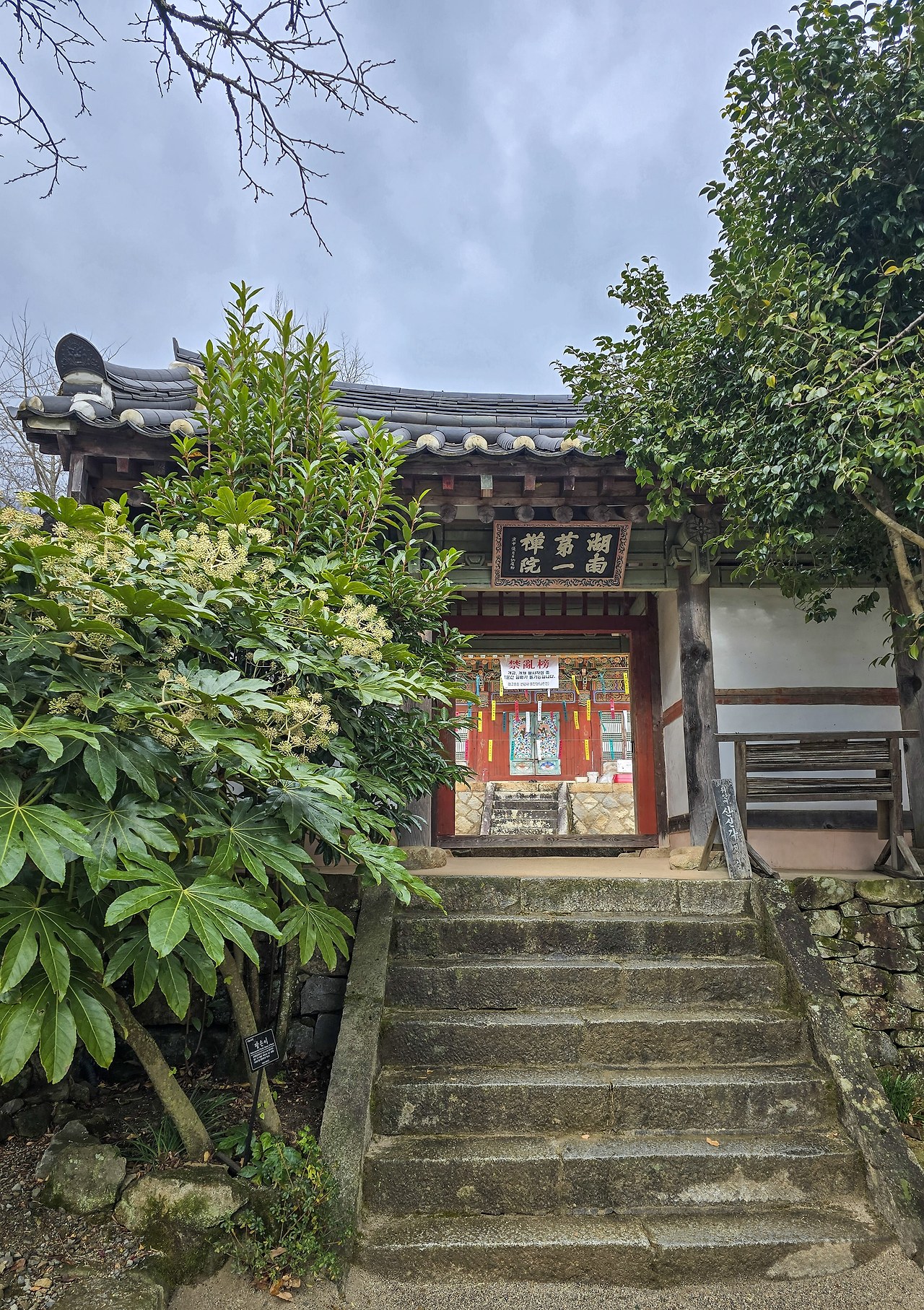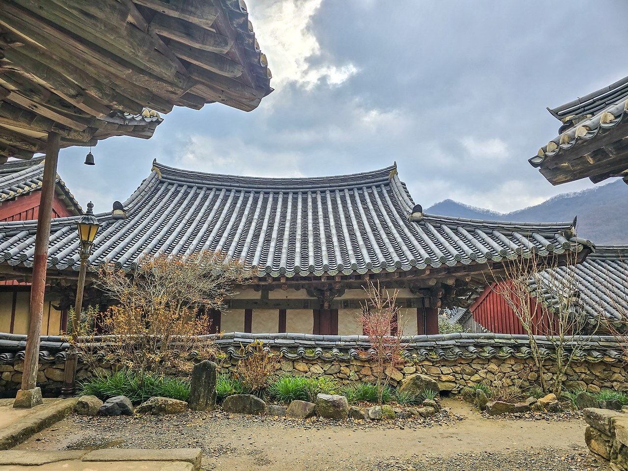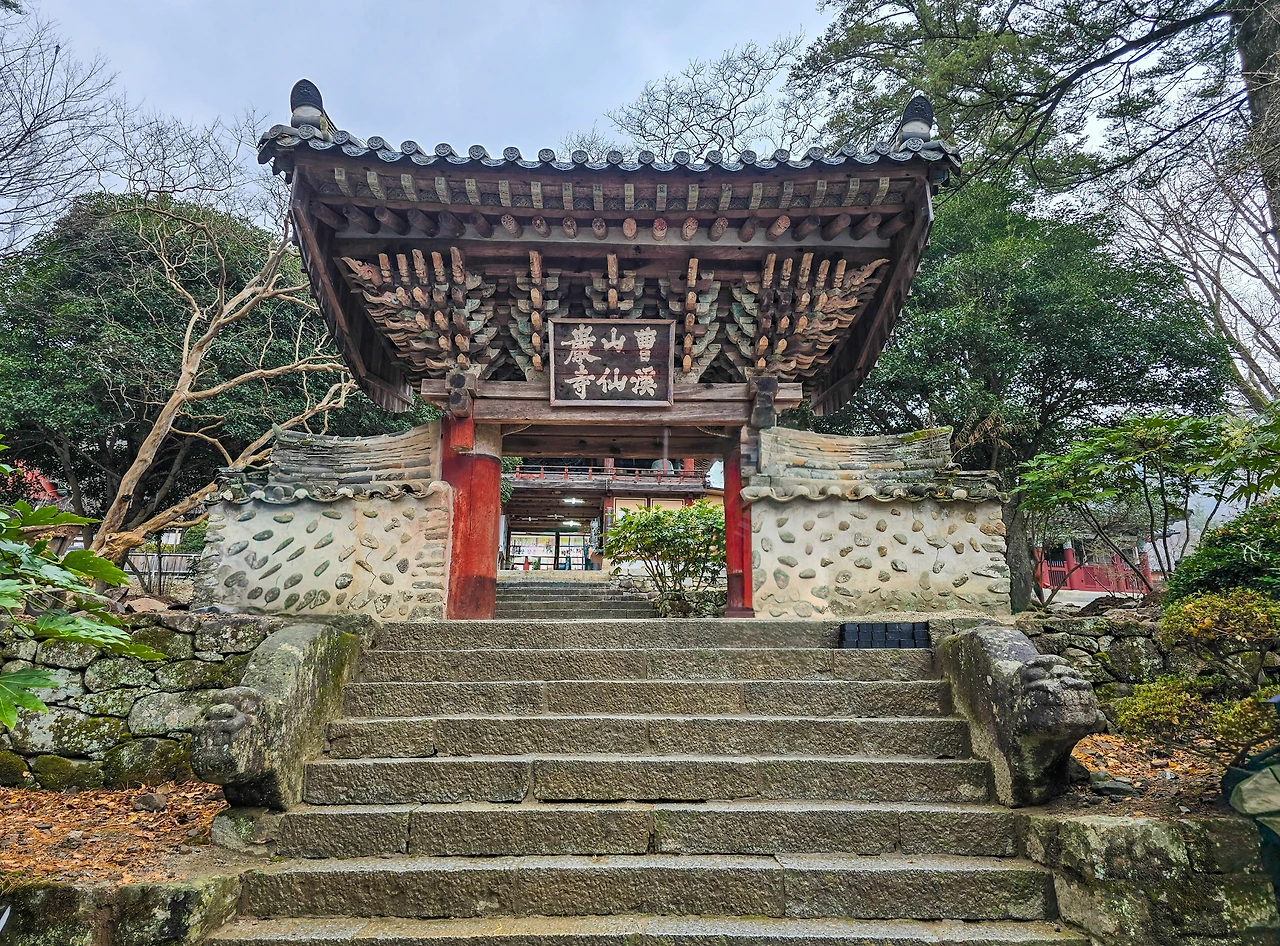 세속의 세상과 불교의 세계의 경계를 이루는 전각, 일주문이다. 작은 담벼락과 붉은 빛의 기둥이 유니크하다.