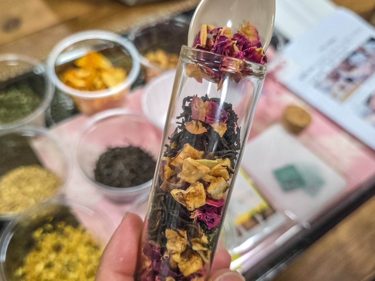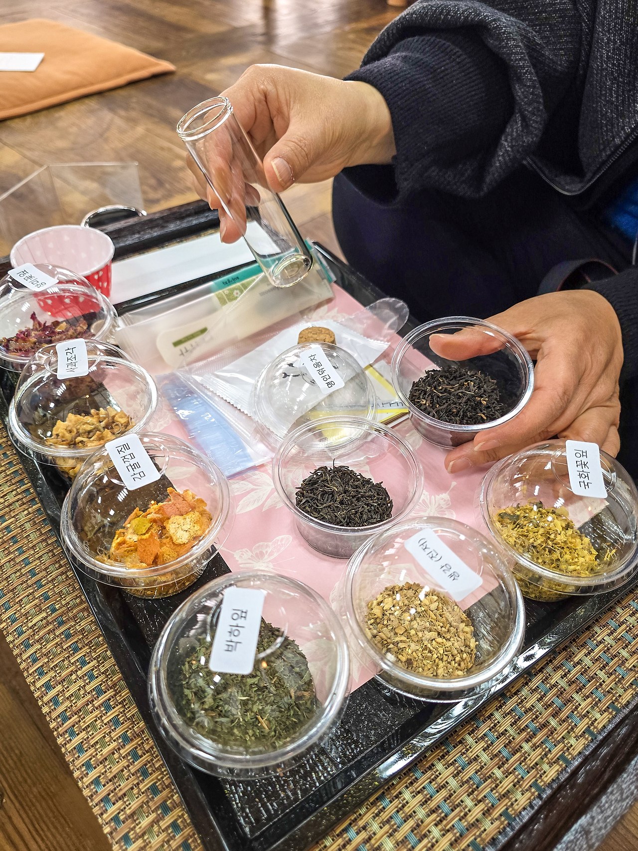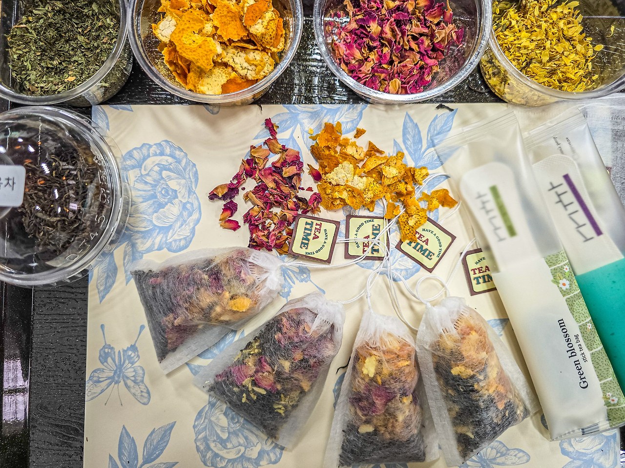 티 블렌딩 체험은 명인 덖음차와 홍차 베이스에 다양한 향기와 맛을 더해서 특별한 수제차를 만드는 체험이다. 박하잎, 감귤껍질, 생강, 국화꽃잎, 말린 사과조각, 장미꽃잎 등 종류도 다양해서 블렌딩하는 작업이 흥미롭고 즐거웠다. 체험을 위해 준비된 다양한 차의 재료는 모두 나만의 블렌딩 차로 담아서 가져갈 수 있다.