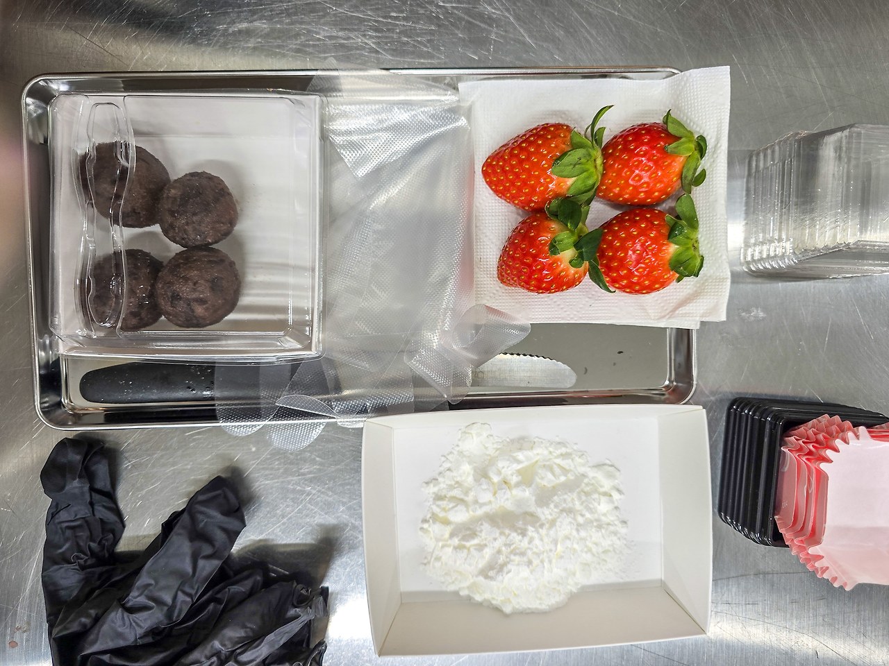 만듦새의 주인장이 미리 만들어놓은 팥 알심과 딸기, 찹쌀떡 반죽이 준비되어 있었다. 찹쌀 반죽을 얇게 펴서 그 안에 딸기를 넣고 그 위에 팥 알심으로 딸기를 싸고 찹쌀반죽으로 전체를 감싸면 딸기 떡이 완성된다. 반으로 갈라서 딸기가 보이게 한 뒤 플라스틱 케이스에 넣어서 상자에 담았다. 야생차 한 잔에 어울리는 디저트다.