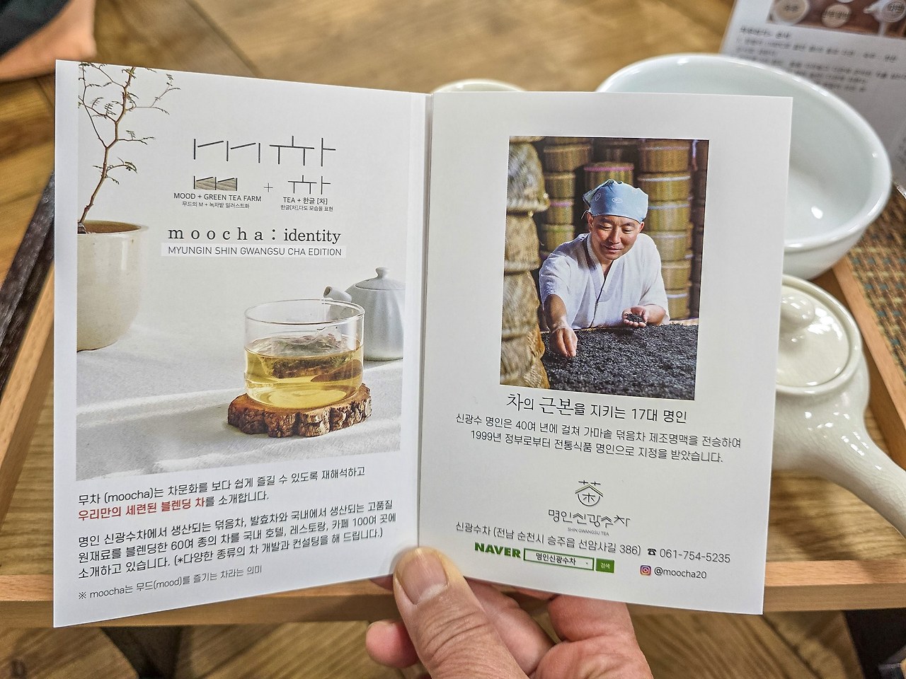 신광수 명인의 차 다원은 순천 조계산 기슭에 있다. 차가 건강하게 자라는 자연 속, 야생차밭을 산책하고 순천 야생차 체험관으로 이동했다. 신광수 명인의 차를 직접 내리는 다도체험과 나만의 차를 만드는 티 블랜딩 체험까지 향기로운 티타임을 가졌다. 신광수 명인의 자녀가 17대 명인의 대를 이어 순천의 차를 알리고 있다.