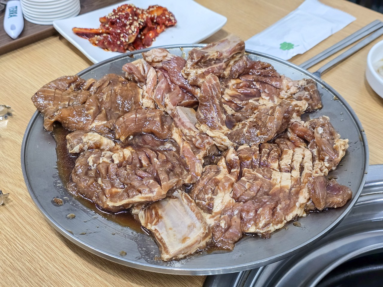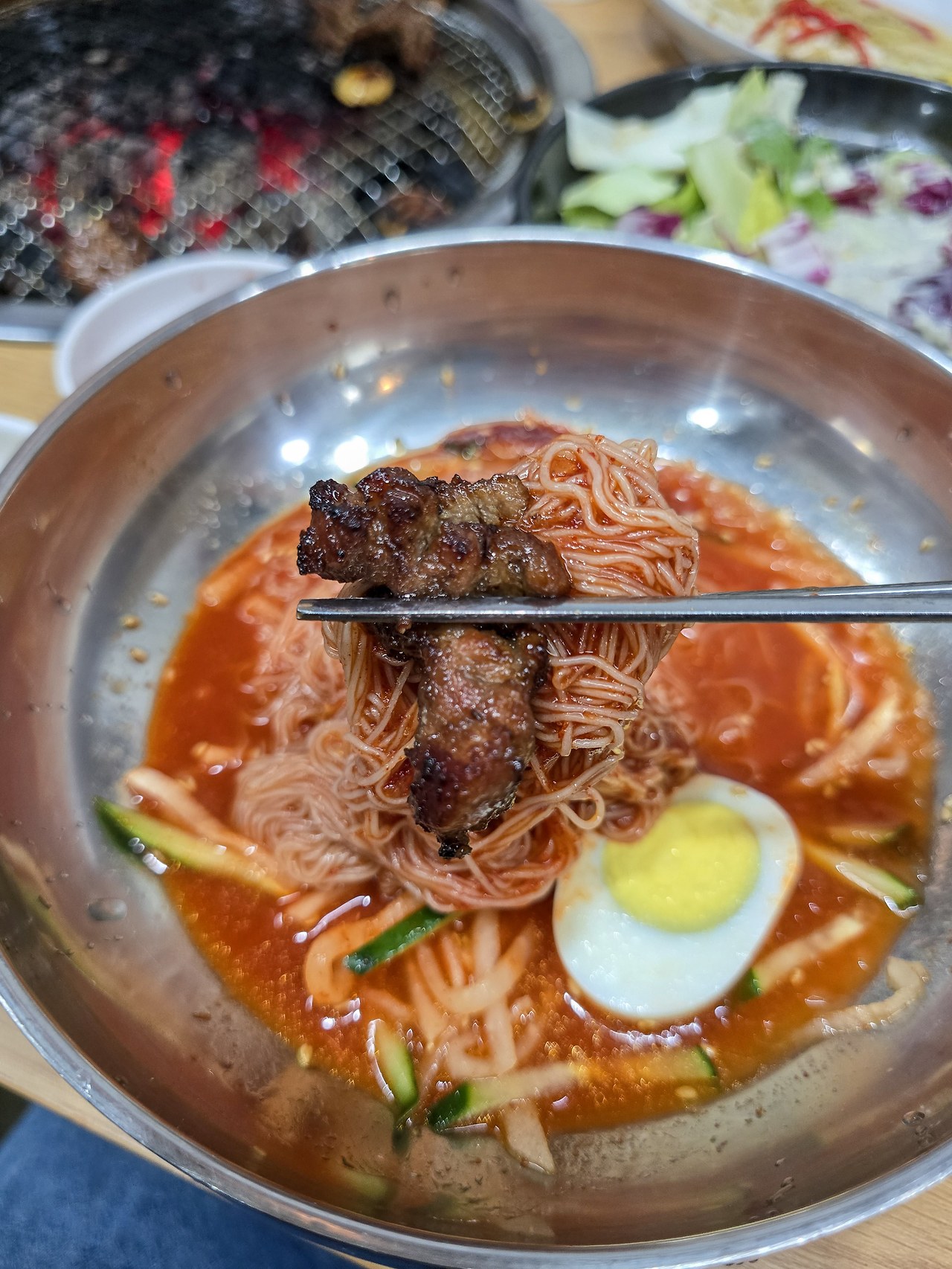 하동에 가면 늘 섬진강에서 채취한 재첩국이나 재첩무침을 먹었는데, 숯불돼지갈비와 냉면이라니 신선한 저녁이었다. 돼지갈비 때깔만 보아도 손맛의 내공이 느껴지는데, 익혀서 먹었더니 돼지갈비도 남도의 맛은 특별했다. 비빔냉면에 숯불향을 제대로 입은 돼지갈비 한 점의 조화는 하동 맛집의 새로운 발견이라고 해도 좋다.