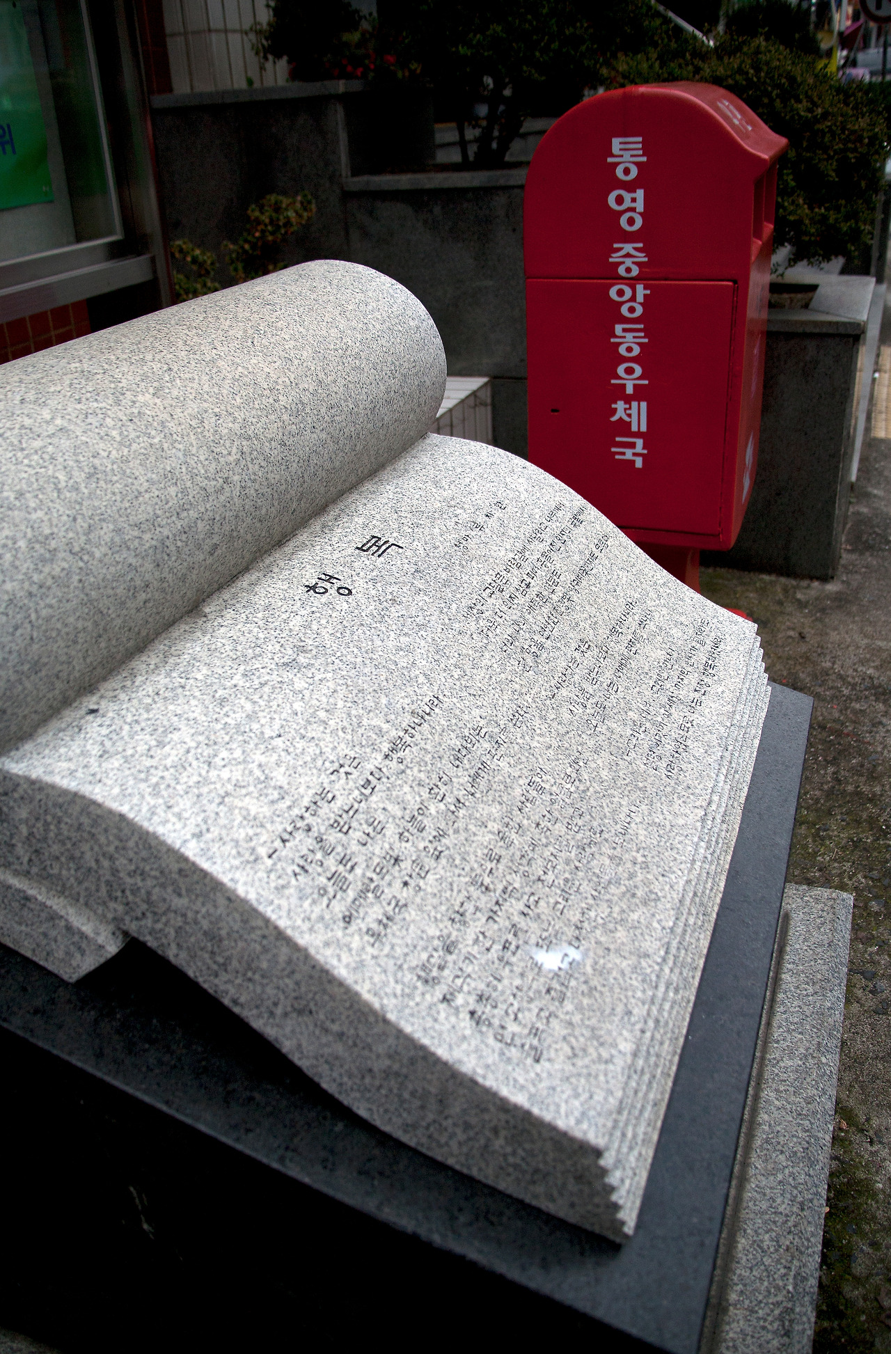 통영 중앙우체국 앞의 청마 문화거리에 가면 사랑에 빠진 시인이 편지를 쓰고 있다. <사랑하는 것은 사람을 받느니 보다 행복하나니, 오늘도 나는 에메랄드빛 하늘이 환히 내다 뵈는 우체국 창문 앞에 와서 너에게 편지를 쓴다.>