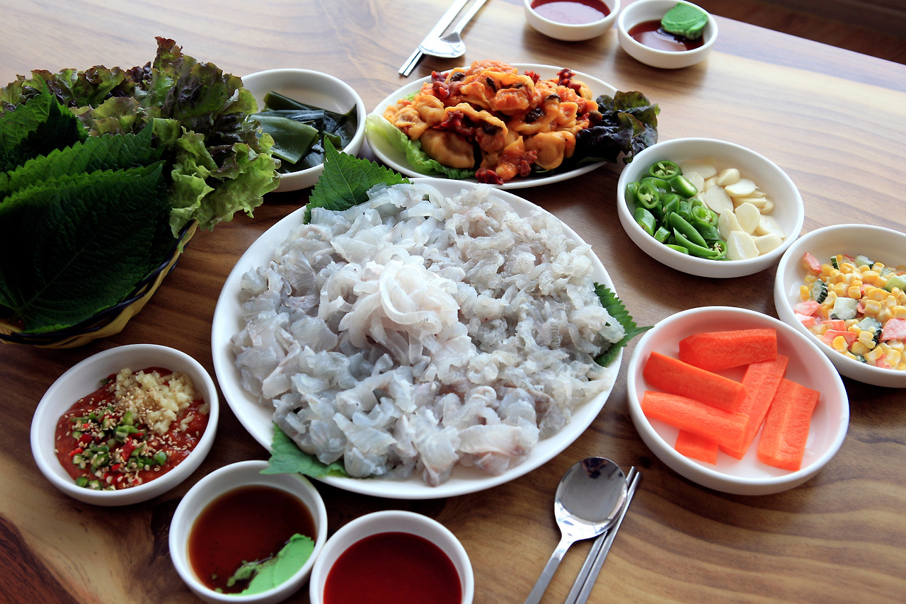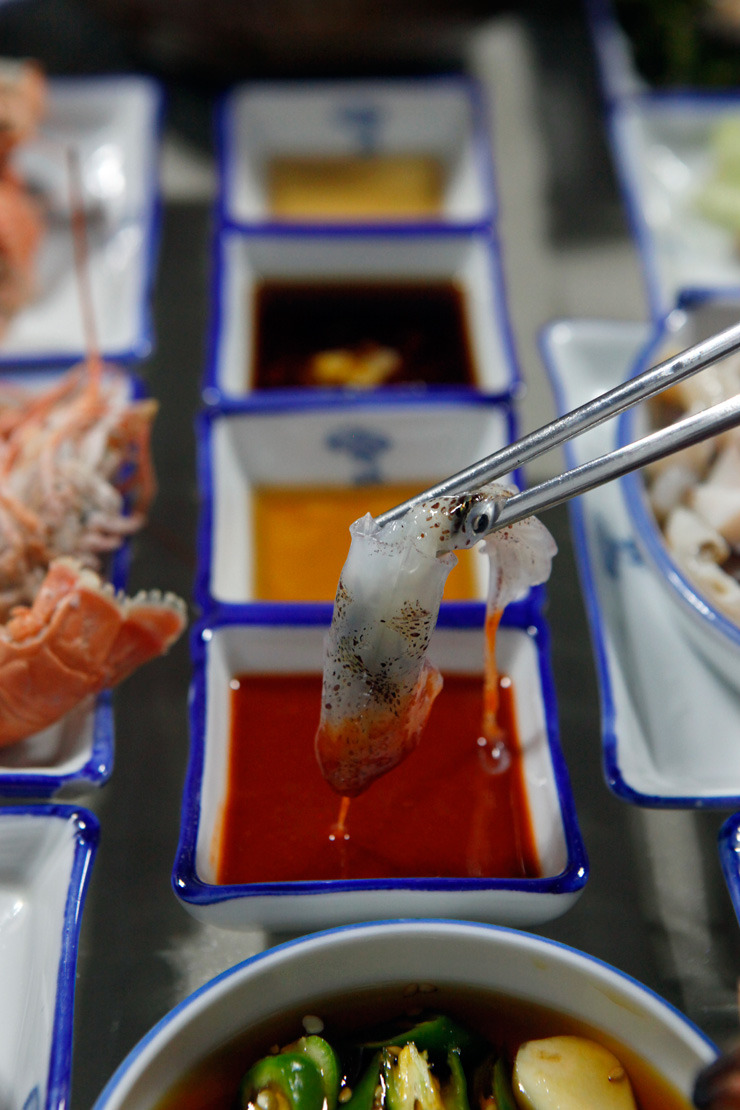 도시 사람 눈엔 난생처음 맛보는 해산물도 수두룩하다. 호루래기라고 불리는 꼴뚜기 회부터 광어, 학꽁치, 가오리가 소담스럽게 나온다. 해삼과 미더덕회에다 털고동까지 귀한 해물이 줄줄이 나오고 산 낙지에 가리비, 새우, 주꾸미, 문어숙회에 딱새우까지 진수성찬이 따로 없다. 복어껍질무침은 눈에 익은데, 장어내장 수육의 비주얼은 입이 딱 벌어질 만큼 생소하다. 통영사람들만 먹는 음식이라는데, 처음 맛보는 식감에도 반할 만큼 쫀득하고 내장 특유의 구수한 뒷맛이 환상이다.