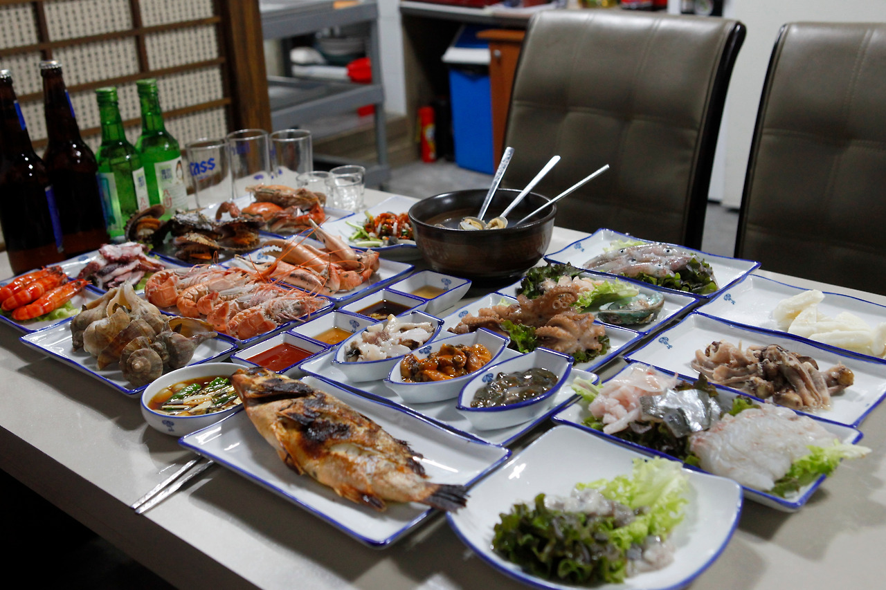 기본 상차림이 나오고 비워지는 접시 따라 새로운 안주들이 테이블을 채워가고 술이 추가될수록 맛있는 안주가 나와서 또 술을 부른다. 가격에 맞추어 상차림이 차려진다고 해도, 술잔이 오가며 거나하게 취해가는 이들에게 정성껏 챙겨서 나오는 서비스 안주는 정겹고 맛깔스럽다. 안주 접시를 들고 온 주인장에게 세상 사는 이야기를 건네기도 하고 맛있는 안주에 달콤한 예찬을 날리고 싶어 진다. 중앙시장이나 서호시장에서 새벽 장을 보며 값싸고 싱싱한 해산물을 사다가 손님에게 제공하는 즐거움과 보람이 주인장의 얼굴에도 가득하다.