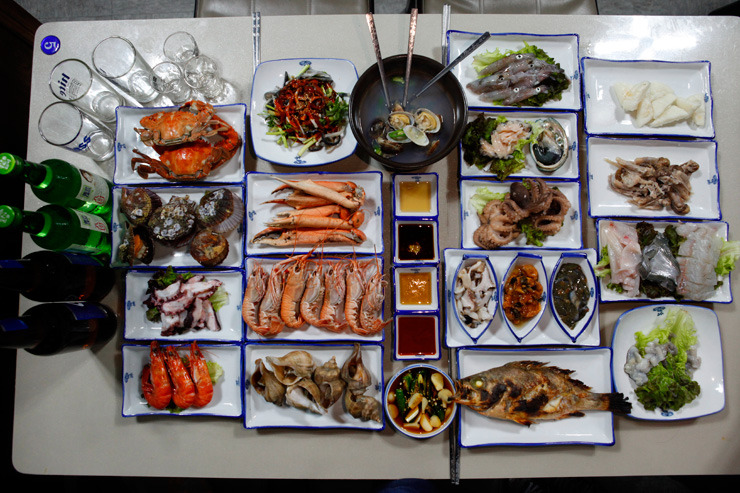 꾸덕꾸덕하게 말려 쪄낸 생선찜, 달곰하게 삶아낸 소라, 향긋한 꽃게찜, 쫄깃한 가리비찜이 첫 상에 나오고 쫀득하게 삶아낸 문어는 즉석에서 큼직하게 잘라준다. 매콤하고 짭조름하게 조려낸 생선조림에는 밥 한 공기가 따라 나온다. 싱싱해서 젓가락을 대기만 해도 툭툭 떨어지는 살이 입안에서 살살 녹는다. 칼칼한 조개탕도 시원하다. 적당하게 마신 술과 든든하게 채운 밥으로 기분 좋은 마무리가 되는 순간이다.