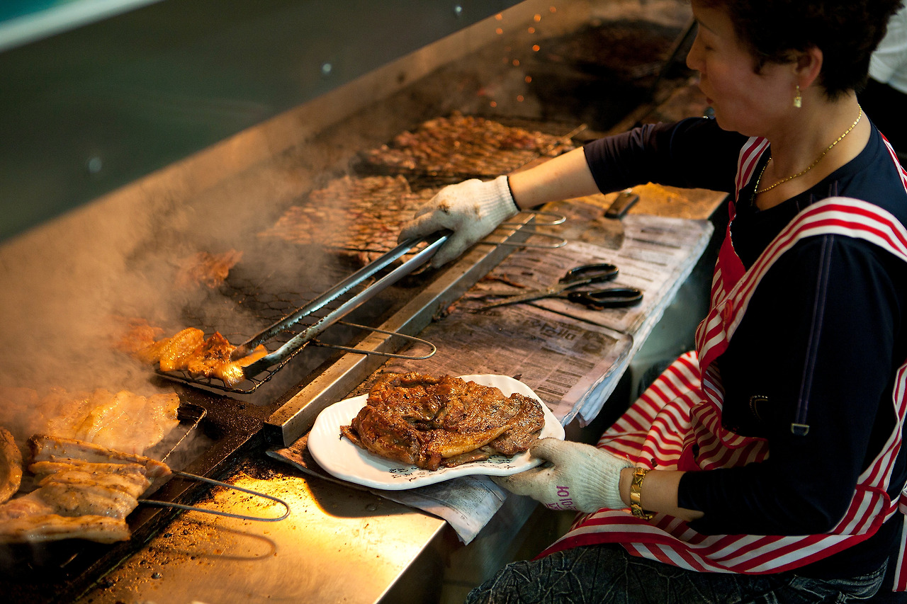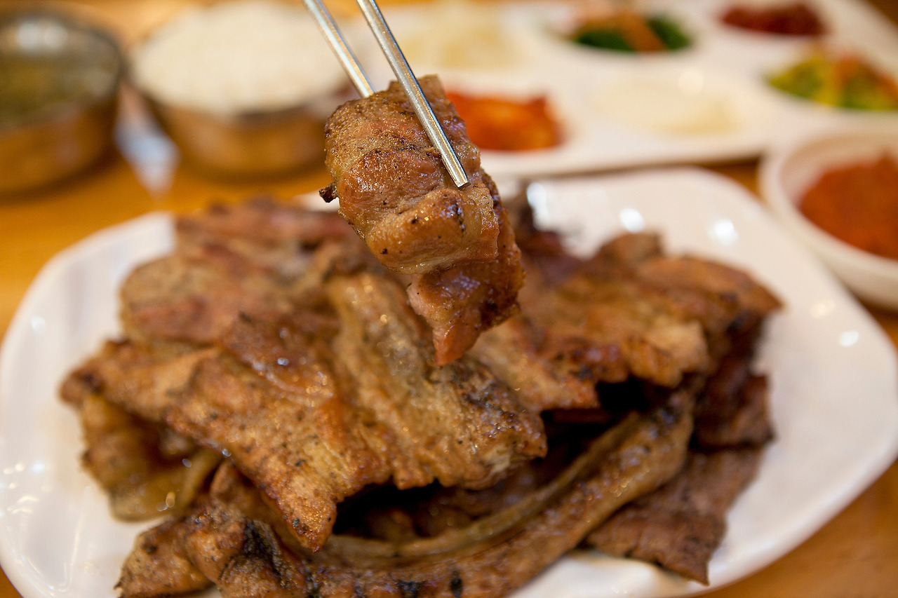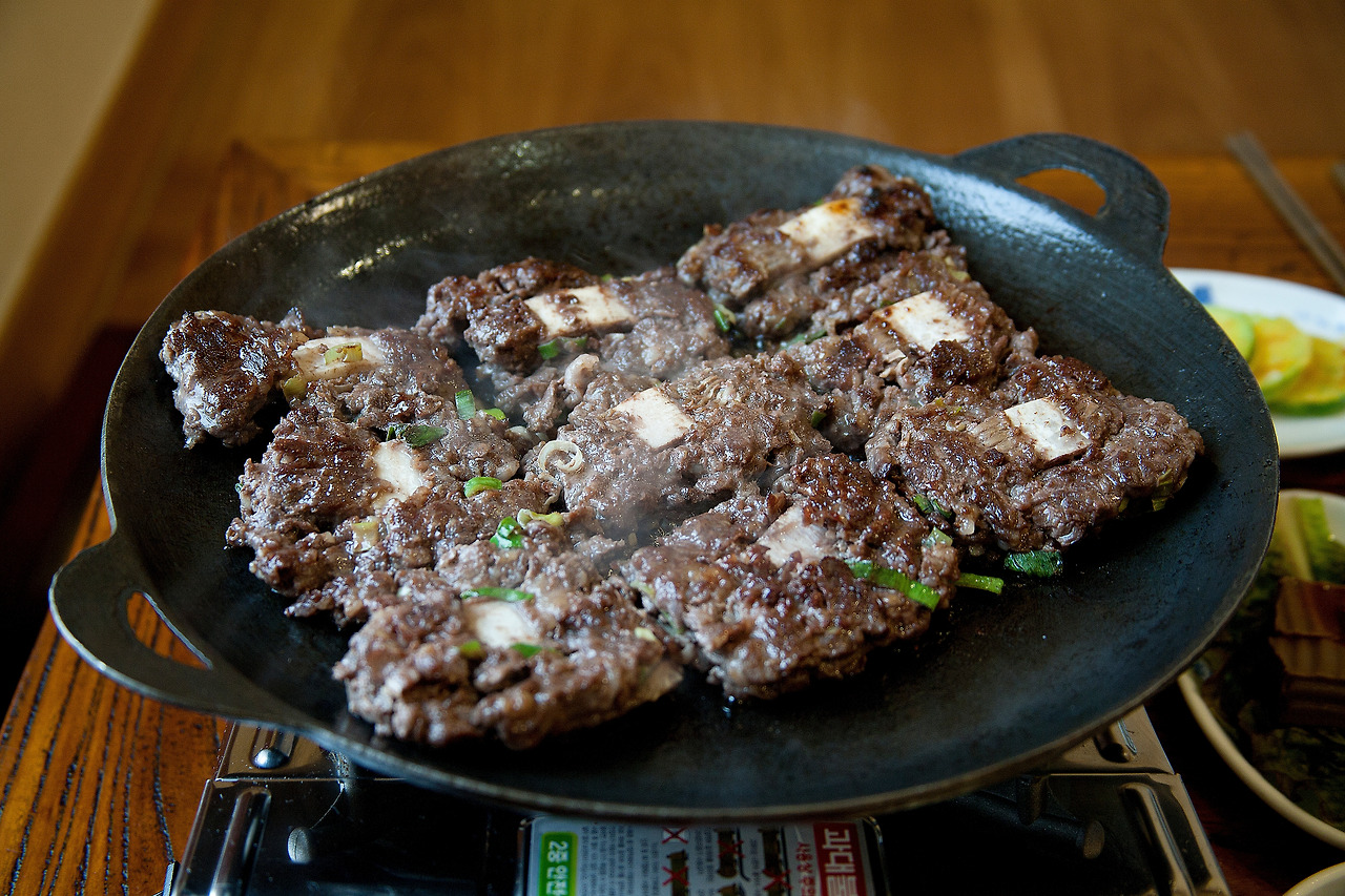 식당입구의 참나무 숯불 위에서 세 차례에 걸쳐 구워지는 돼지갈비는 기름기가 쏙 빠지고 쫀득한 식감에 훈제향이 더해져 왠만한 소갈비 부럽지 않다. 나오는 반찬도 종류가 많아서 밥 한 공기 시키면 푸짐한 밥상이다.
