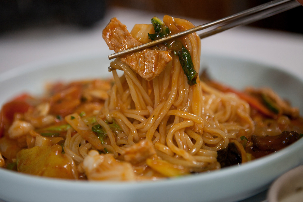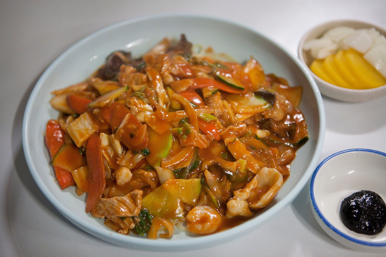 주문이 들어가면 바로 수타를 쳐서 나오는 면이라 면의 굵기는 제각각인데 50년 손맛이라 쫄깃한 맛이 일품이다. 해산물과 채소가 큼직하게 썰어져 바특하게 졸인 매운 소스와 버무려진 매운 면은 첫맛이 꽤 칼칼해서 입맛이 돈다. 쫄깃한 면발에 매콤한 소스를 듬뿍 묻혀서 먹다 보면 중독성이 있어 비 오는 날 생각날 만한 맛이다.