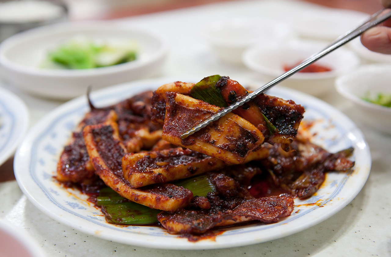 단골식당의 비법은 무엇일까, 부엌 뒤쪽을 들여다보았다. 식당 뒤편으로 활활 타고 있는 연탄불이 서 너 개 있고 불 담당 직원이 따로 서 있다. 주문이 들어오면 되지불고기든 오징어불고기든 첫 번째 연탄불 위에서 프라이팬으로 1차 초벌구이를 한다. 반쯤 익은 듯하면 두 번째 연탄불위의 석쇠로 옮겨져 불향을 내며 바짝 구워진다. 여기에서 본래 재료의 잡냄새는 날아가고 그윽한 불향만 남는다고 곁에 서있던 주인장이 슬며시 거든다. 고추기름에 재워놓았던 오징어는 육질이 부드러워지고 그 칼칼한 양념에 밥을 비벼 먹어도 맛있다.
