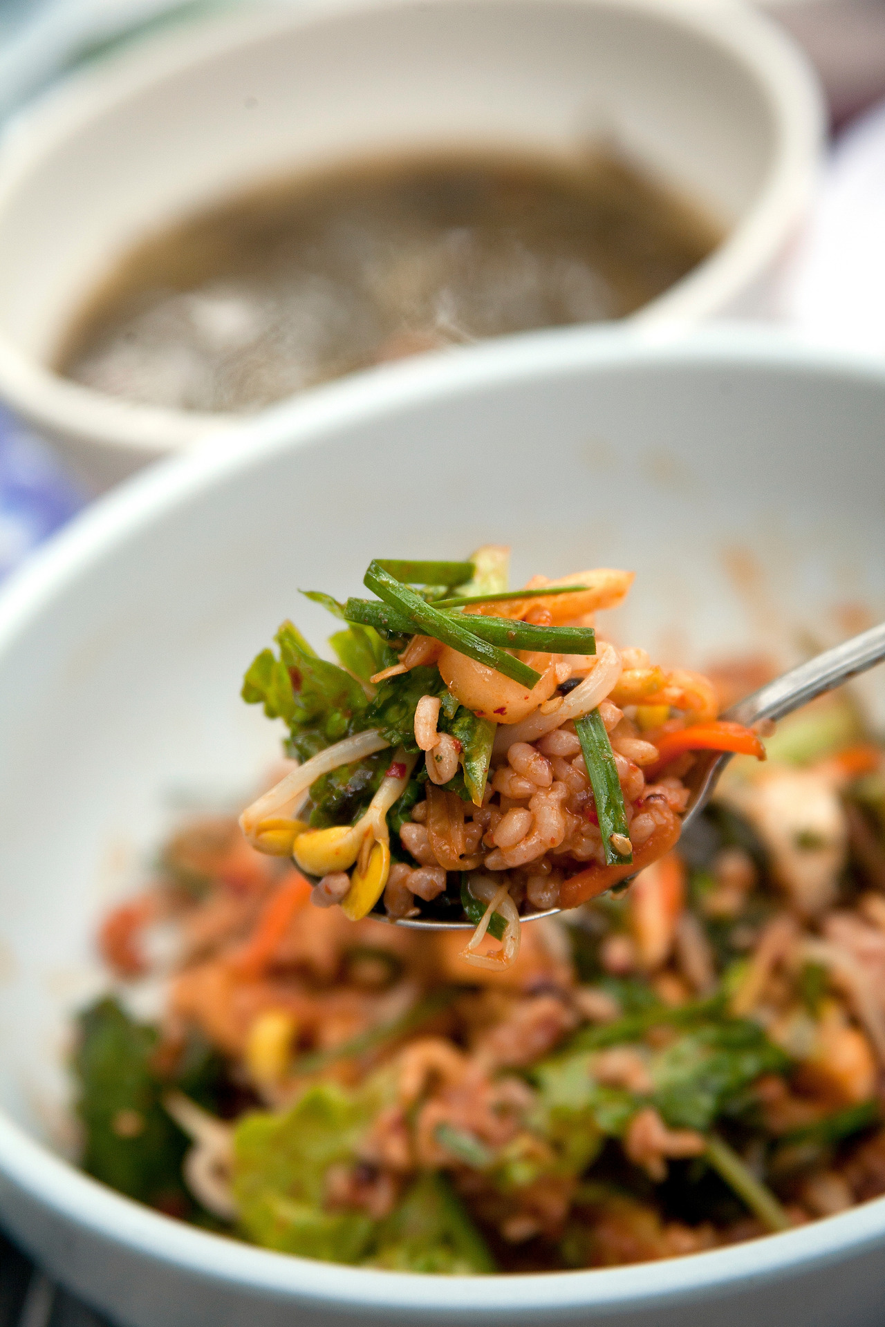 조계산 중턱으로 가는 길, 선암사와 송광사를 잇는 울창한 고갯길이 굴목이재다. 굴목이재 고갯마루에는 30년 세월을 느티나무와 함께 보낸 정겨운 산중식당인 조계산 보리밥집이 있다. 울창한 숲과 계곡을 지나 2시간여 산행 뒤에 맛보는 막걸리 한 잔과 산채보리밥은 한마디로 꿀맛이다. 계절마다 바뀐다는 나물 반찬과 채소는 맛깔스럽고 신선하다. 취나물, 무생채, 겉절이, 오이무침, 상추무침, 머위나물, 참나물 모두 산에서 뜯거나 텃밭에서 거둔 것들이다. 보리밥에 온갖 나물을 넣고 고추장과 참기름을 넣어 숟가락으로 쓱쓱 비비면 세상에서 가장 맛있는 산채비빔밥이 완성된다. 2시간 넘게 걸어왔건만 먹는 시간은 10분도 안 걸린다.