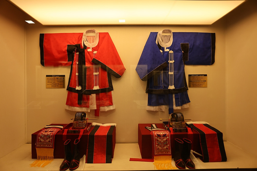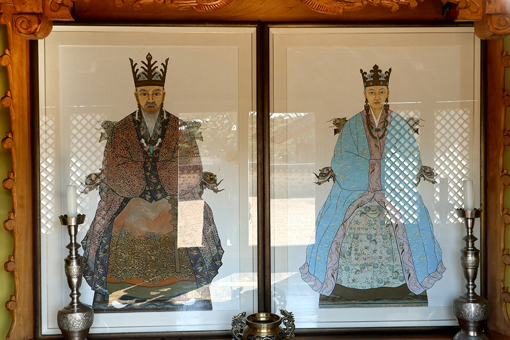 수로왕릉 가락유물관에 전시중인 제례복(좌), 납릉 옆 숭정각에 있는 수로왕과 허왕후의 표준 영정