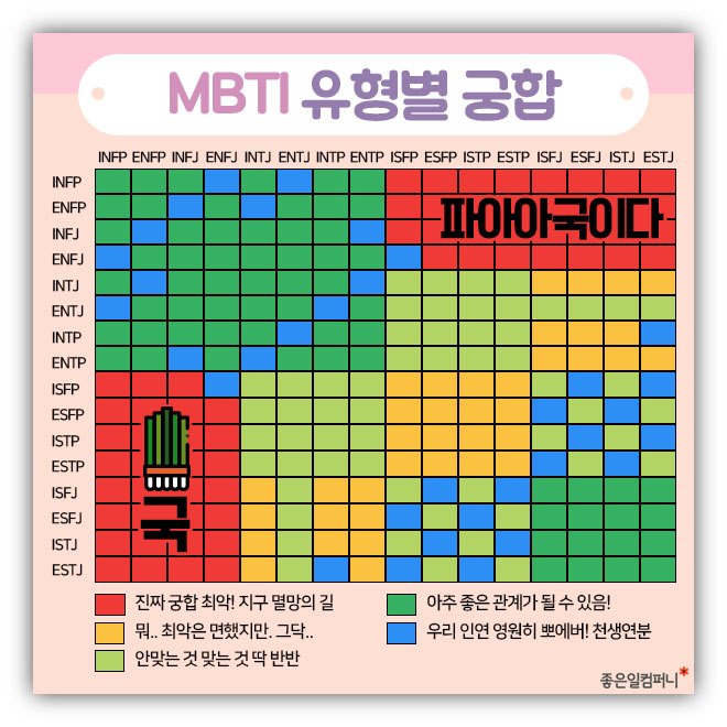 이와 같이 MBTI의 양면성을 모두 이해하면 자신의 성격유형과 여기에서 파생된 연애유형이니 궁합 등을 신봉하지 않을 수 있다. 그냥 쉽고 편안하게 즐기는 무료의 ‘나와 너 이해 심리테스트 놀이’ 정도로 받아들이게 될 것이다. 과신하고 편견 갖고 선 긋고 그런 유치한 거 하지 말자. 무슨 무슨 유형이니까 나랑 잘 맞을 거야, 혹은 맞지 않을 거야라는 환상을 버리자. 우리는 모두 열 길 물속은 알아도 한 길 사람 속은 모르는 무지한 인간일 뿐이지 않은가. 직접 만나고 부딪히고 서서히 알아가자. 진실은 환상을 깨는데서 시작되는 거니까.