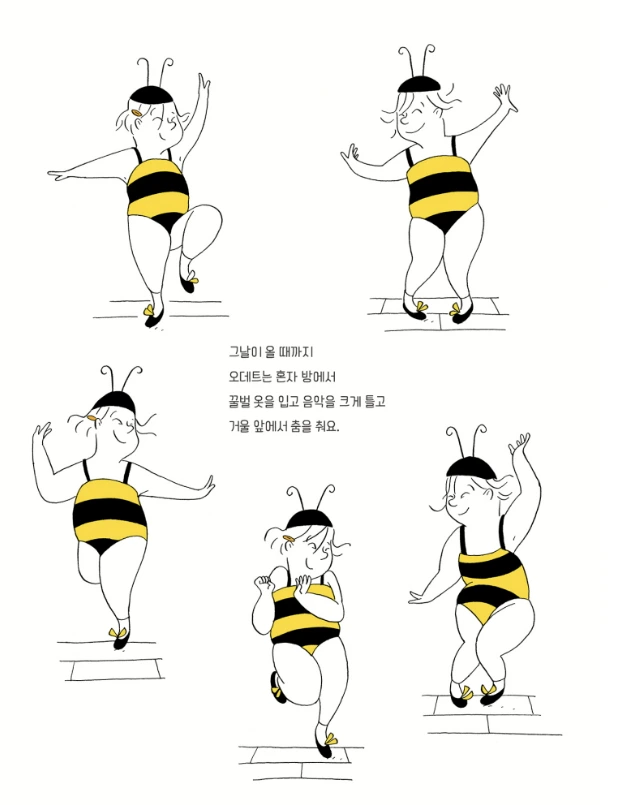 오데트는 치즈를 듬뿍 얹은 볼로네제 스타게티를 좋아하고, 좋아하는 작가가 있을 정도로 책읽기도 좋아한다. 특이하게 꿀벌 옷을 입고 음악을 크게 틀고 거울 앞에서 춤추는 것도 즐길 줄 아는 나름 취향이 있는 아이다. 이랬던 아이가 날씬해져서 인기를 얻고 싶어 먹는 즐거움을 포기한다. 하지만 초콜릿 앞에서 참지 못하는 자신을 미워하기도 한다. 그러던 중 운이 좋게 자신이 가장 좋아하는 작가를 교실에서 만나게 된다. 아이는 작가가 케이크라면 사족을 못 쓰고 몸집이 엄청 크지만, 모두를 그녀가 하는 이야기에 빠져들게 하는 매력에 반하게 된다. 그러고 나서 아이는 사람들에게 보이는 자신의 모습을 신경 쓰지 않게 된다. 작가가 되겠다는 꿈에 집중하고, 자신의 욕구도 존중해준다. 자신이 좋아하는 작가처럼 볼로네제 스파게티에 치즈를 잔뜩 얹어 먹으면서. 통통한 몸매를 드러내 자신만의 꿀벌 춤도 추면서 말이다.