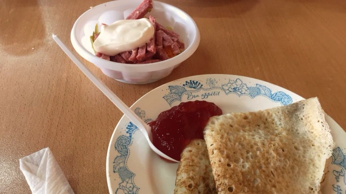 특히 이 러시아 식 팬케이크는 딸기잼을 발라먹는데