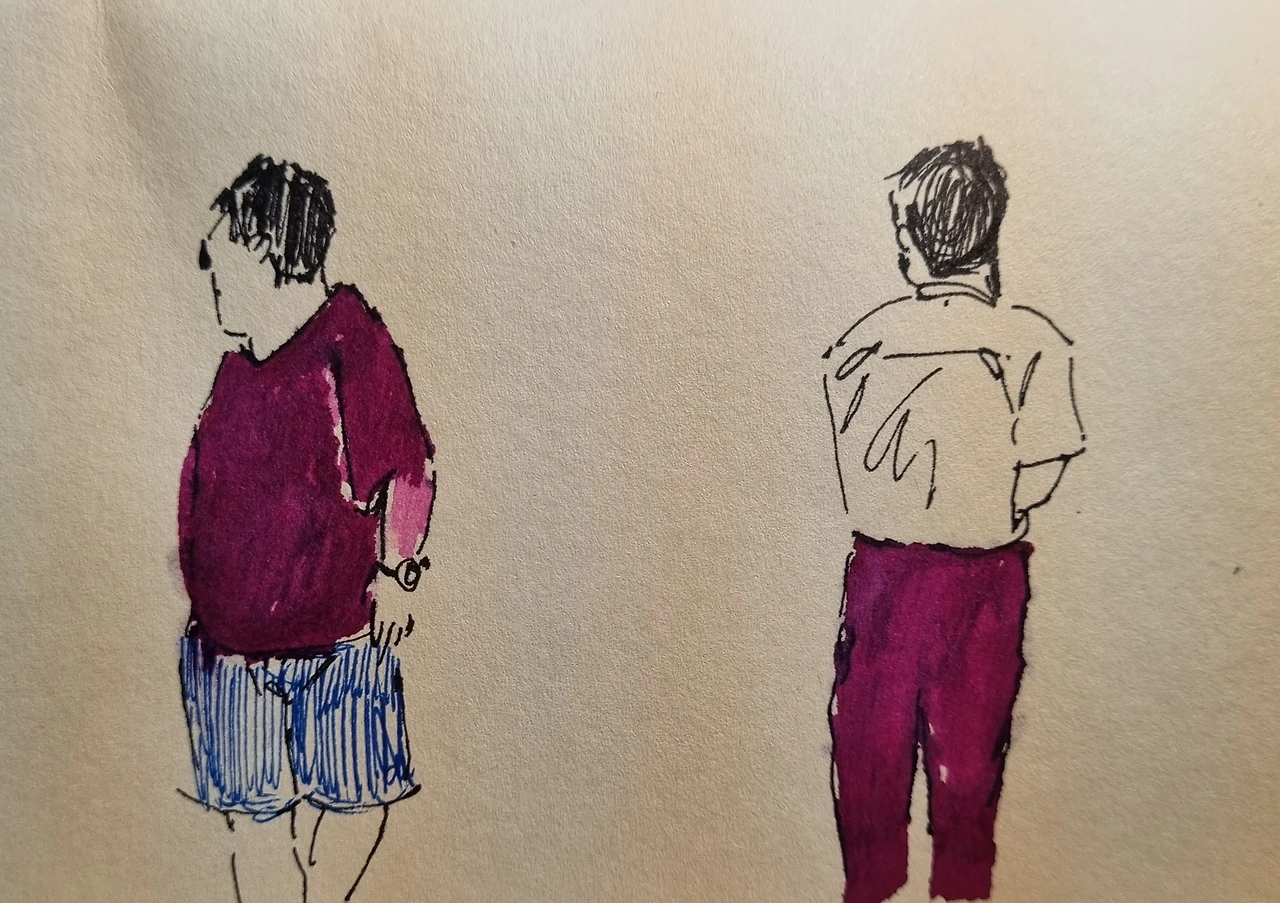 - 드라마에서 주인공과 아주 가까운 사람들 외에 중요한 사람들이 바로 연극반 동아리 동료들이다. 여러 명의 조연들이 있는데, 서사의 중요한 부분을 끌고 가는 캐릭터임에도 불구하고, 이상하게도 잘 눈에 들어오지 않는다. 이 드라마를 감상할 때, 조연들의 얼굴이 잘 보이지 않는 현상은 아마도 주인공의 서사가 몹시 압도적인 탓도 있을 것이다. 드라마 후반부로 가면서 캐릭터의 정형성 등으로 인해 조연들의 개별성이 잘 드러나지 않는 것이 아쉬웠다. 나는 조연들이 흐릿하게 보이기 보다는 또렷하게 보이는, 그런 드라마를 더 좋아한다. 그런 아쉬움에 연극반 동료들이 볼링 치는 장면에서 2명의 뒷모습을 그려봤다.