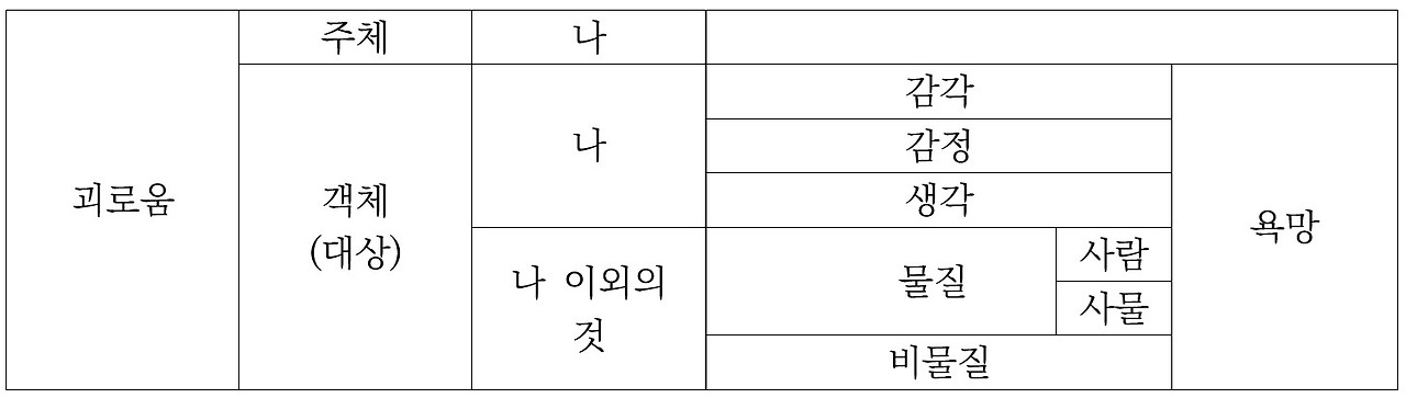 먼저 괴로움이 발생하면 괴로움을 느끼는 자와 괴로움을 주는 대상이 존재한다. 다시 말하면 괴로움을 느끼는 주체인 ‘나’가 존재하고, 내가 괴로움을 느끼게 만드는 객체인 ‘대상’이 존재하게 된다. 정리하면 아래의 표와 같다.