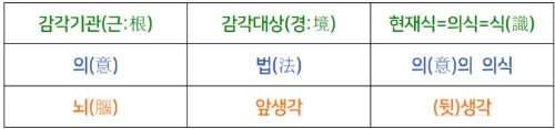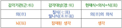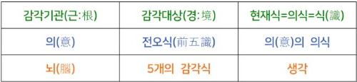 5개의 감각식을 감각대상으로 보고, 그 생각이 일어나는 것을 아는 뇌(腦)를 감각기관으로 보고, 그래서 만들어지는 생각을 현재식(現在識) - 의식(意識)으로 보는 것이다.