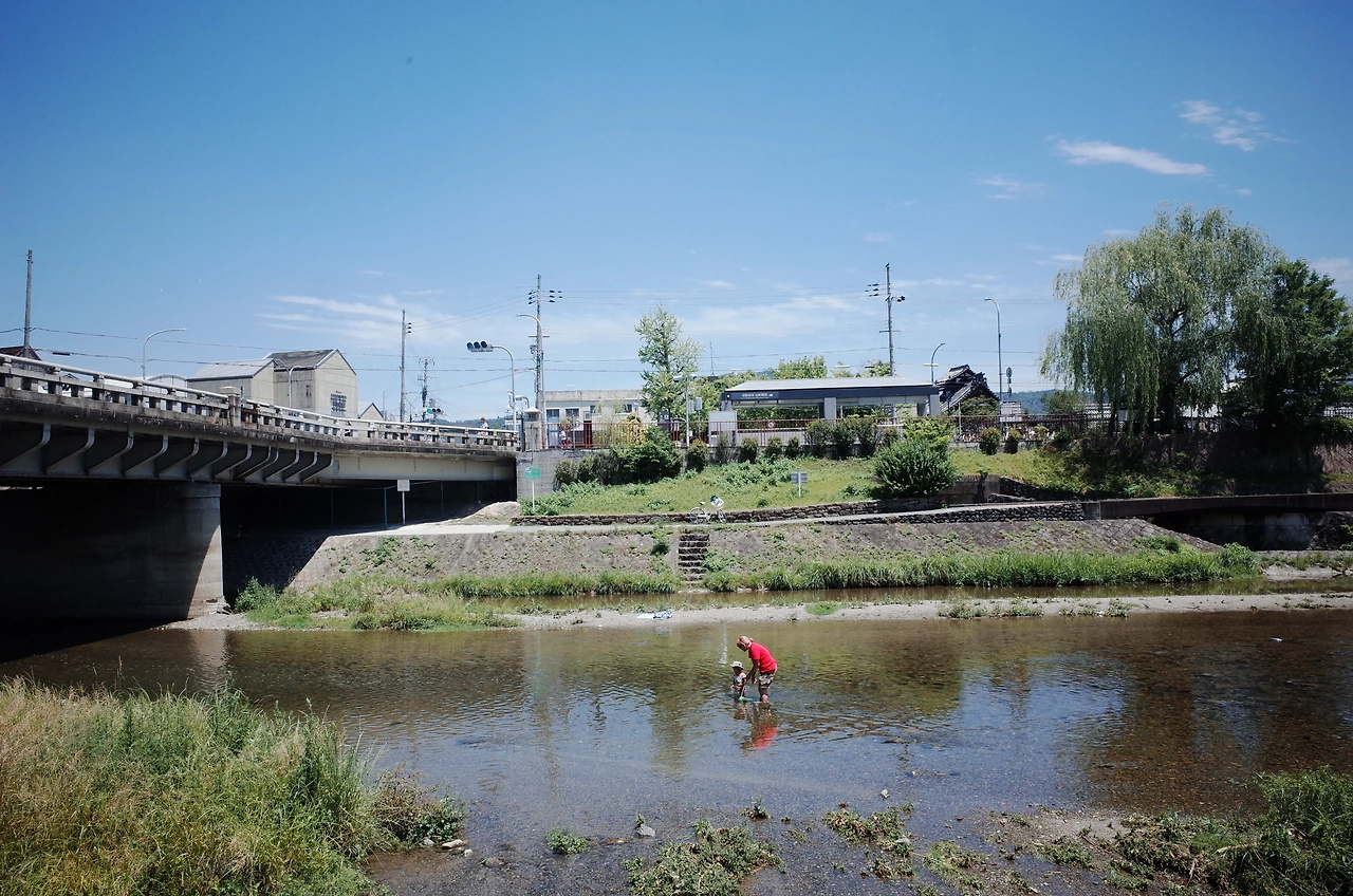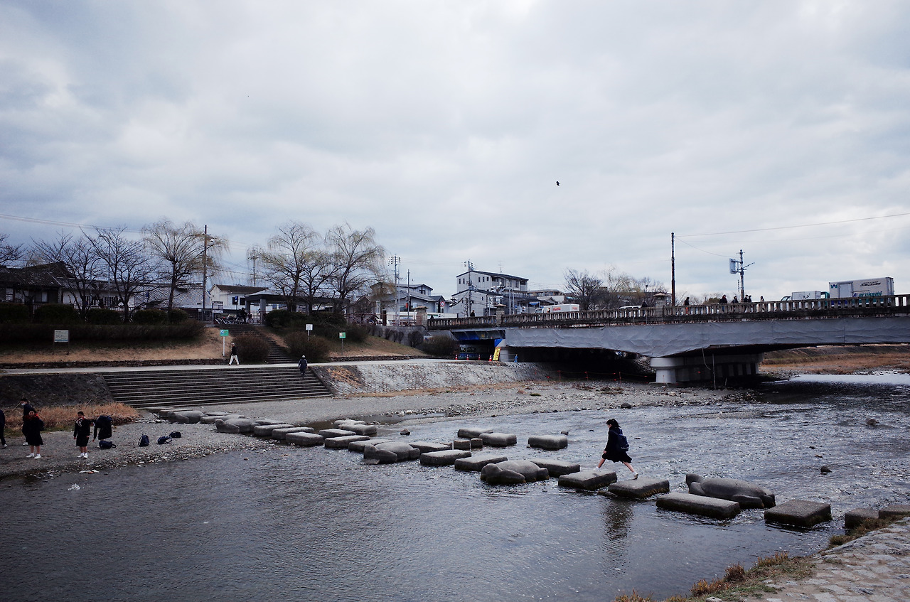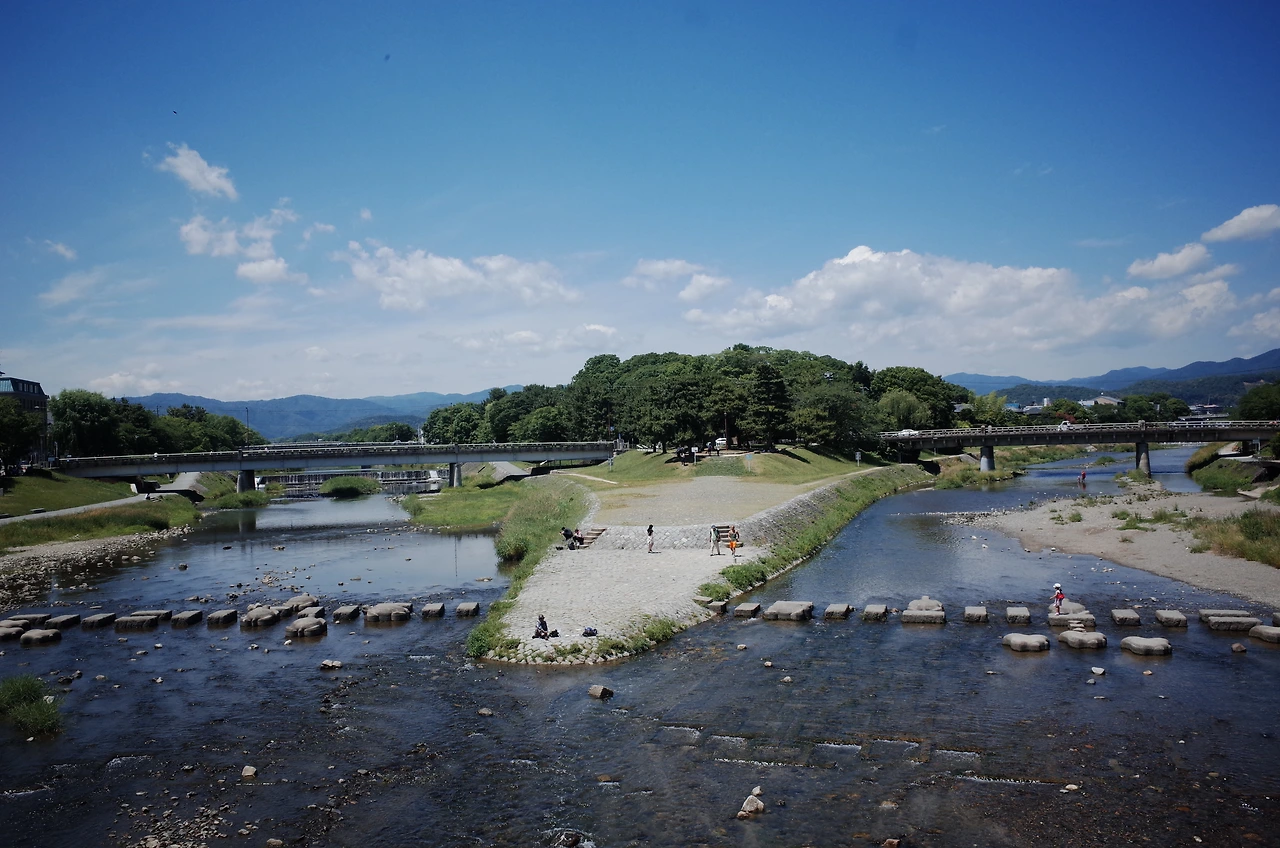 숲을 빠져나온 뒤 당연하다는 듯 가모가와 델타를 향해 발이 움직였다. 가모강賀茂川과 다카노강高野川의 두 물줄기가 합류하는 지점인 이곳은 섬처럼 생긴 삼각주가 강 한가운데 놓여 있는 독특한 장소다. 가모가와 델타는 얼핏 자연이 만들어 낸 천연 놀이동산 같았다. 약속이라도 한 것처럼 이곳을 찾은 사람들은 하나 같이 추억 놀이에 빠진다. 어른, 아이 할 것 없이 거북 모양의 징검다리를 폴짝폴짝 건너거나 물수제비 뜨기 시합을 겨룬다.