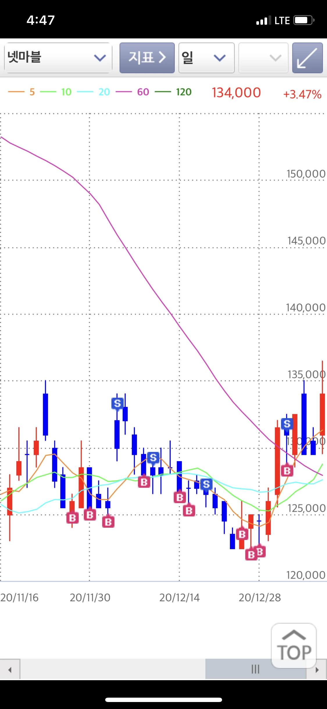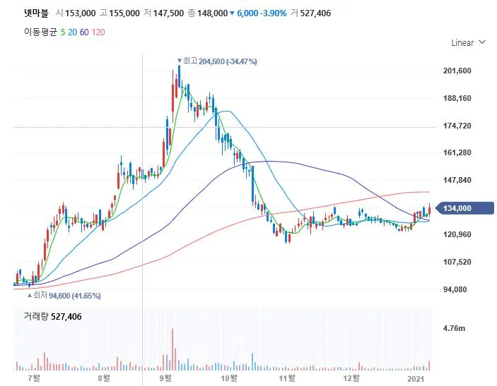 넷마블은 지난 9월 20만 원이라는 고점을 기록하고