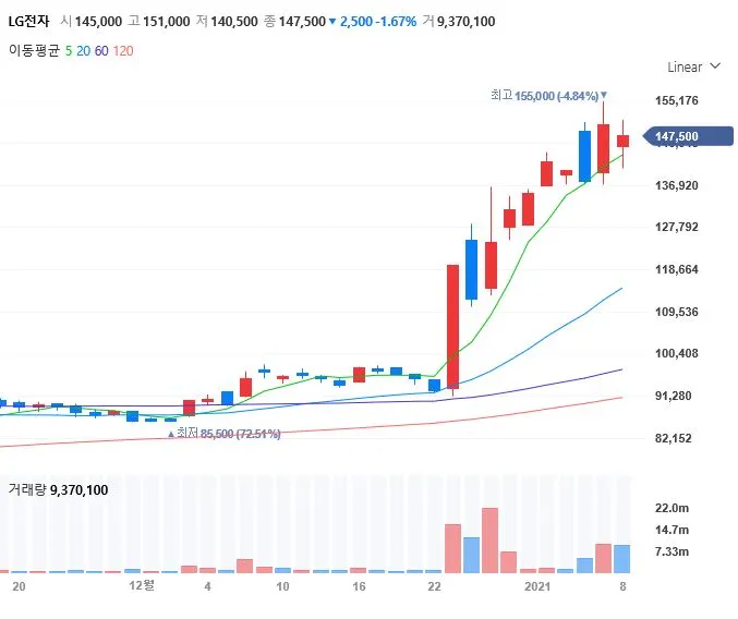 일전에 설명한 전기차 테마에 탑승한 LG전자는