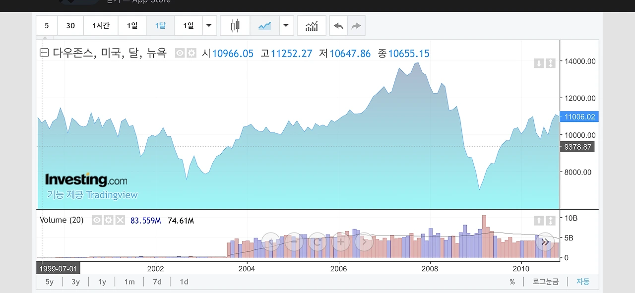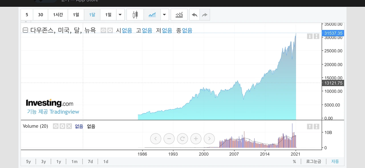 1980년대부터 오늘까지의 미국 다우존스 차트를 보면