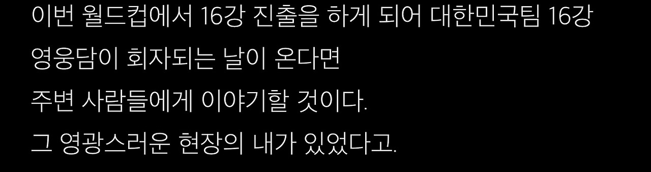 이 글을 작성할 당시만 하더라도 가슴으로는 대한민국의 16강 진출을 염원했지만 머리로는 그런 기적 같은 일은 벌어질 리 없을 거라고 생각했다. 조별예선에서 같은 조였던 우루과이, 가나, 포르투갈 어느 하나 만만한 나라가 없었다. 대한민국은 최약체로 꼽혔고 많은 사람들이 대한민국의 3패, 잘해야 1무 2패를 할 거라 점쳤다. 그러나 언제나 그러했듯이 대한민국이란 나라는 기적을 만들어 냈다. 포르투갈전에서 승리하고 16강 진출을 확정 지었던 당시 이곳 현장 분위기는 20년 전인 ‘2002년 4강 신화‘를 이룩해내었을 때 못지않았다고 자부한다. 한국에 돌아가면 주변 사람들에게 이야기할 것이다. 그 영광스러운 현장에 내가 있었다고.