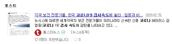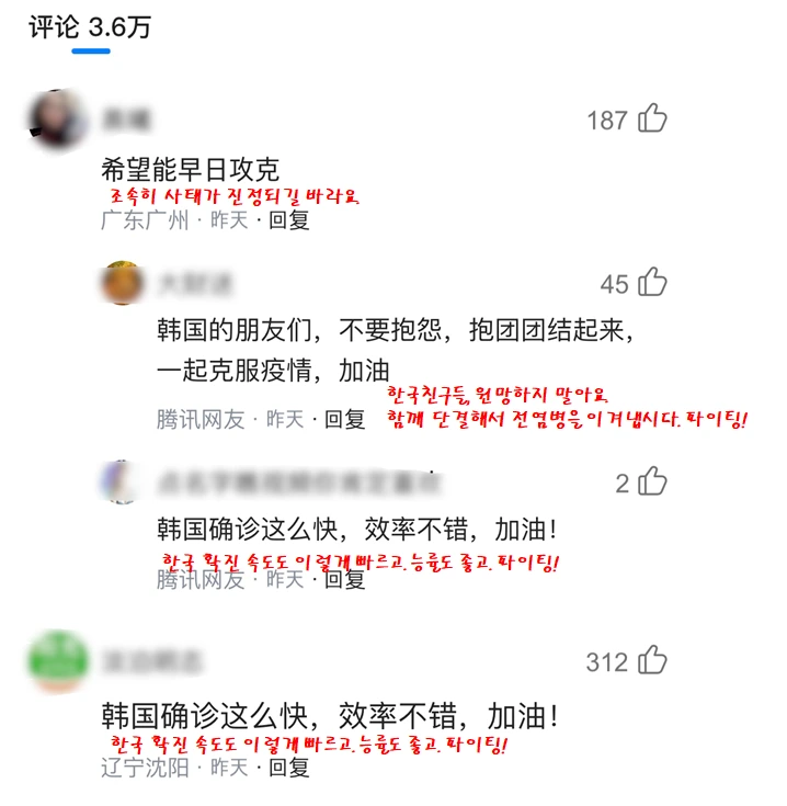 처음으로 한국의 확진 속도를 칭찬한 댓글이 보인다.