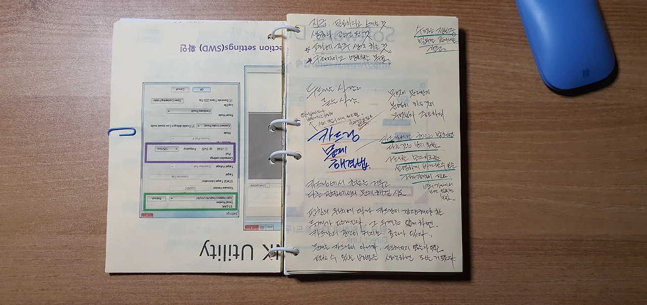왼쪽의 펀칭 위치는 카드링이 감당해야 할 두께가 두껍고 오른쪽은 보다 얇다카드링에만 초점을 맞추고 있어 다른 것을 보지 못했고 문제를 제대로 바라보지 못했었다. 해결해야 했던 문제는 '카드링'이 아니었다. 진짜 문제는 '펼쳐지지 않음'이었고 펀칭의 위치로 해결할 수 있었다. 그렇게 만들어진 노트는 마음에 쏙 들었다. 회사에서 자연스럽게 발생하는 자투리 시간과 의도적으로 만든 자투리 시간에 마음껏 노트를 사용하고 있다. 이 글도 그 노트에 기록하면서 쓰고 있다.