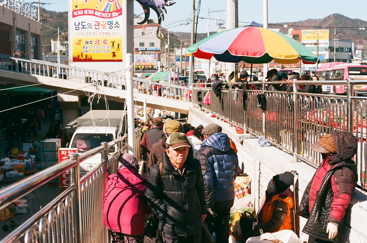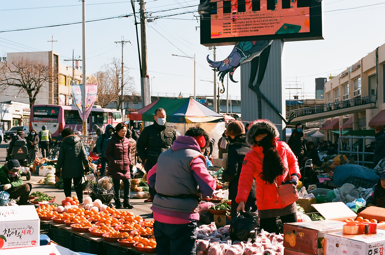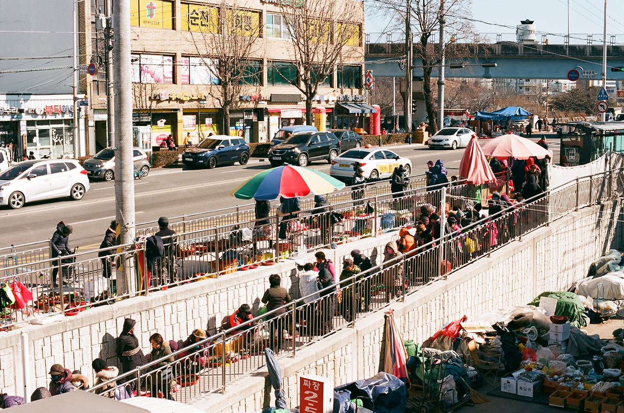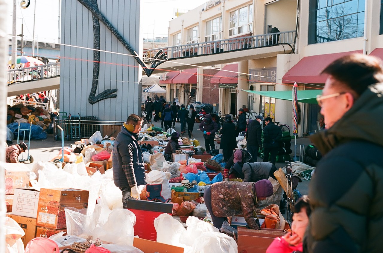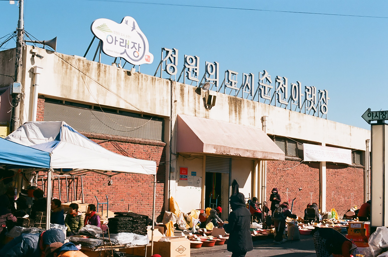 그러나 나의 발목을 붙잡은 건 김이 모락모락 피어나는 국밥이 아닌 엄청난 인파였다. 묵직한 외투를 입은 사람들은 인도를 점거한 채 서로 다른 방향으로 느긋하게 걷고 있었다. 발걸음이 유독 빠른 편에 속하는 나는 본의 아니게 빼곡하게 늘어선 행렬의 리듬에 맞춰 걷기 시작했다. 이들의 걸음이 유난히도 느린 건 행인 대다수가 나이 지긋한 분들이기 때문만은 아니었다. 이곳에서는 길이 곧 장터요, 장터가 곧 마당이었다. 그야말로 왁자지껄한 난전. 손님들은 쉴 새 없이 도로를 따라 펼쳐진 좌판을 훑어 나갔고, 풍로를 품에 안은 상인들은 눌러쓴 모자를 고쳐 쓰며 손님들과 눈을 맞추기 바빴다. 순천 아랫장. 동천의 매서운 추위에도 아랑곳하지 않는 이 시장의 이름이다.
