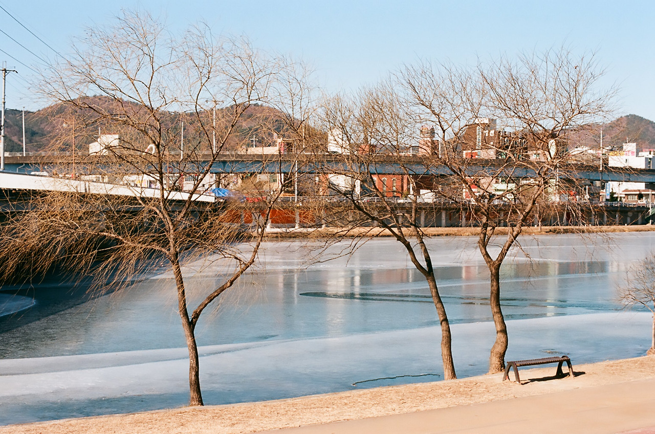 순천역과 가까운 숙소 앞으로는 동천이 흐른다. 아니, 정확히는 얼어붙은 수면 아래로 몰래 흐르고 있었다. 강물의 살갗을 모조리 굳혀버린 차가운 바람 앞에 잠시 고개를 들어 숙소의 외관을 감상하는 것조차 어려울 지경이었다. 칼바람을 온몸으로 맞으면서 나는 야심 차게 챙겨 온 니콘 FM2 카메라에 필름을 넣기 시작했다. 지금 와서 돌이켜보면 겉으로 드러난 모든 살결이 얼어붙는 것을 실시간으로 느낄 수 있던 순간에도 무언가에 취한 듯 추위를 잊은 나 자신의 인내력에 경의를 표하지 않을 수 없다. 그것은 사진을 찍겠다는 강렬한 일념 덕분이었을까? 아니면 주인에게 양말을 받은 도비의 해방감이었을까? 어쩌면 낯선 풍경과 낯선 분위기, 그리고 도저히 익숙해질 수 없는 날씨 속에서 나는 일종의 각성 상태에 빠져 있었을지도 모르겠다.