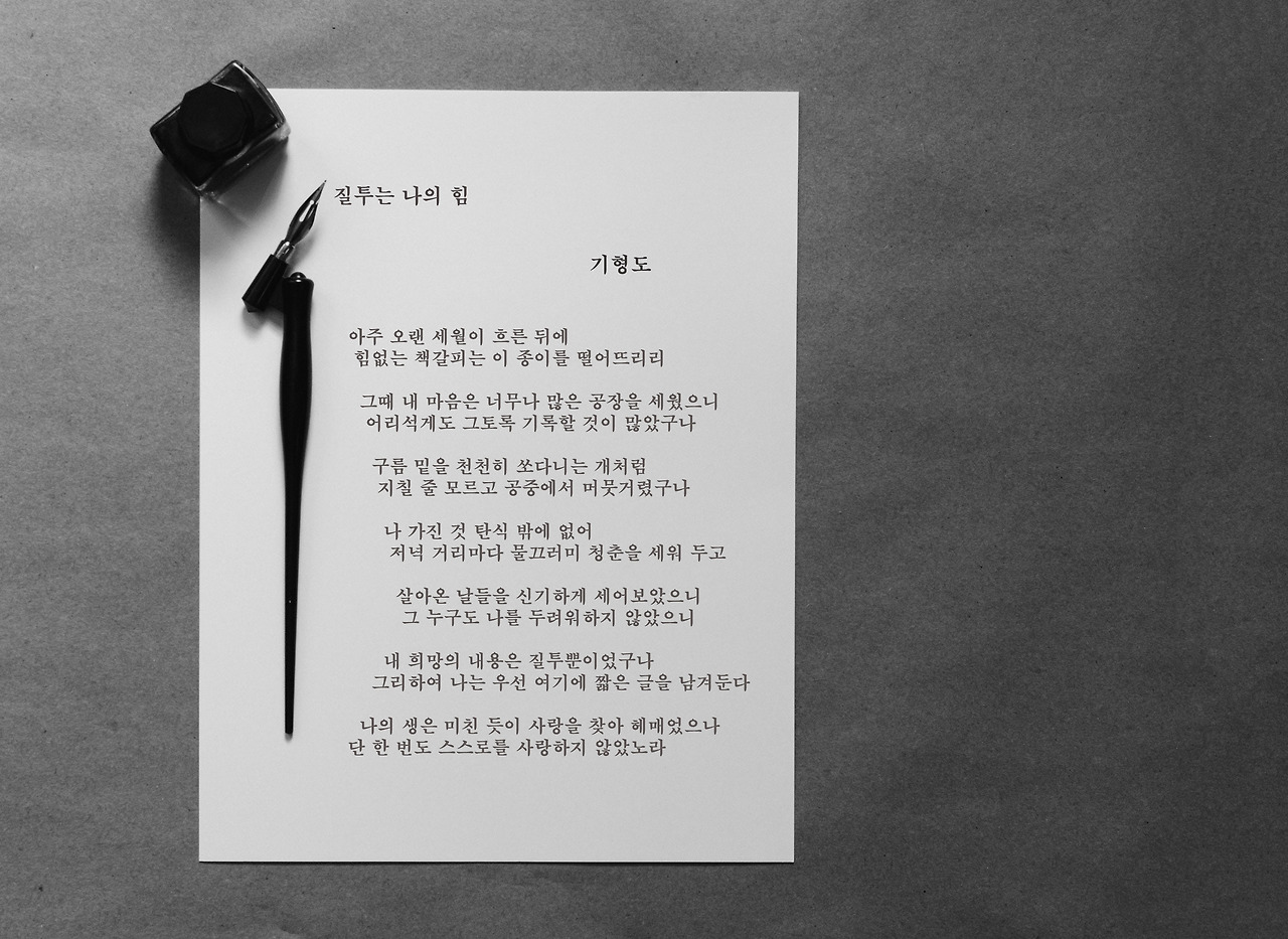 '질투는 나의 힘'이라는 기형도의 시가 있다. 최근에 포토샵을 배우면서 시화 숙제를 내야 하길래 생각없이 골랐었다.