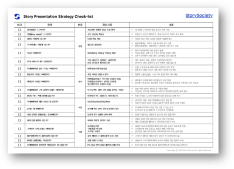 기업 입찰 프레젠테이션의 전략을 수립하기 위하여 어떤 기준과 세부적인 정보가 필요한지 <스토리 프레젠테이션 전략 수립 체크 리스트>를 통하여 알려드리는 시간을 가졌습니다. 이러한 체크 리스트의 경우, 단지 이번 프로젝트만을 위한 정보가 아닌 향후 지속적으로 영업 및 제안에서 활용 가능한 것으로 내부적으로 공유할 수 있도록 별도 자료로 제공해 드렸습니다.