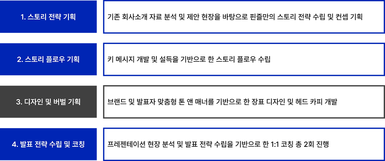 과거부터 현재까지의 분석을 바탕으로 핀즐만의 제안 스토리 전략 3가지를 수립하였고, 이를 바탕으로 전체 프레젠테이션 플로우를 기획하고 CEO 스피치 코칭을 진행하였습니다.