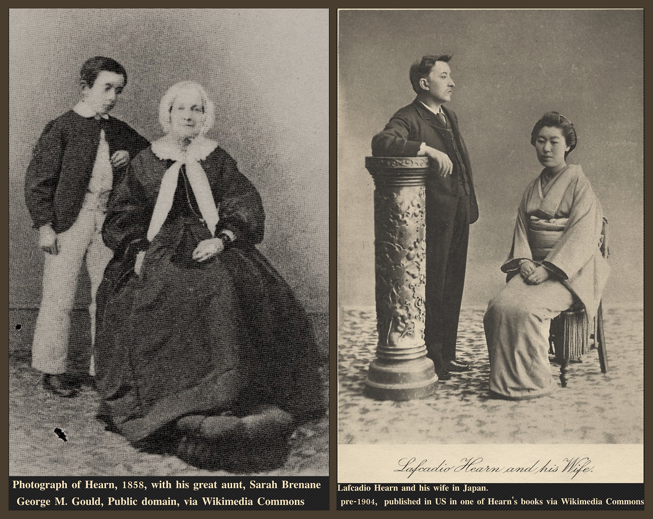 라프카디오 헌은 1850년에 그리스의 이오니아 해에 있는 레프카다 섬에서 그리스 계 어머니와 아일랜드 계 아버지 사이에서 태어났다. 헌의 어머니 로사는 가난한 그리스 섬에서 태어나 그리스 정교를 믿었던 문맹자였다. 헌의 아버지는 점령국인 영국 군대에 복무하는 아일랜드인 외과의사였고, 프로테스탄트 교도였으며, 고등 교육을 받은 인물이었다. 헌의 부모는 성장 배경, 언어, 인종, 종교, 사회 계층이 너무도 다른 사람들이어서 두 사람의 결혼은 이류교혼이나 다름없었다. 다른 세계에 속한 여인과 사랑을 했지만 결혼을 할 생각이 없었던 헌의 아버지는 애인이 혼전 임신을 하자 어쩔 수 없이 결혼식을 올렸다. 하지만 직장 동료들과 가족에게 결혼 사실을 숨긴 채, 아버지는 결혼 이후 아내와 아들들을 내버려 두고 홀로 서인도 제도로 근무하러 떠났다. 남편에게 버림받은 헌의 어머니는 첫 번째 아들을 잃고 둘째 아들인 라프카디오를 홀로 힘들게 키웠다. 이 사실을 알게 된 시댁 식구들이 모자를 더블린으로 불러들였다. 두 살 된 아들과 함께 그리스를 떠나서 낯선 더블린에 와서 살게 된 헌의 어머니는 새로운 환경에 제대로 적응하지 못해서 정신병원에 수용될 정도로 많은 아픔과 고립감을 겪었다. 세 번째 아이를 임신한 헌의 어머니는 네 살 된 아들을 더블린에 남겨둔 채 다시 그리스로 돌아갔고, 헌의 아버지는 종교적인 문제를 빌미로 삼아서 결혼을 무효화하였다. 헌은 어머니에게 네 살 때 버림받았지만 평생 그리스인 어머니를 아일랜드인 아버지보다 더 사랑하고 그리워했다.