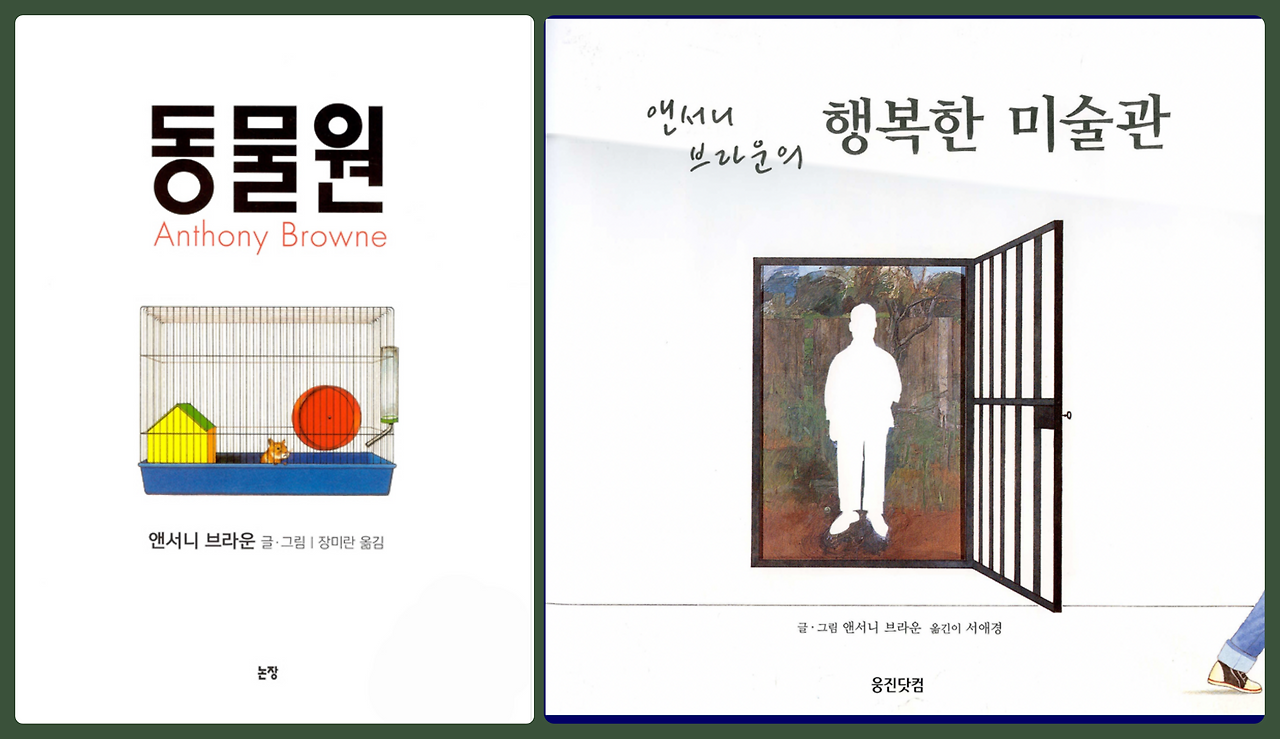 ⟪앤서니 브라운의 행복한 미술관⟫(서애경 옮김, 웅진주니어 2004)은 삶을 바라보는 작가의 따스한 시선과 유머 감각이 돋보이는 그림책이다. 이 그림책이 내게 예사롭지 않게 느껴지는 것은 예전에 브라운이 출간한 그림책에 담긴 문제, 즉 ‘인생이란 감옥에서 우리가 벗어날 수 있는 길은 과연 없는 것일까?’라는 질문의 답을 넌지시 알려주는 듯싶기 때문이다. 브라운의 많은 그림책에 나타난 인간과 사회를 바라보는 시각은 그다지 밝지 않았다. 이는 1992년에 발표된 ⟪동물원⟫(장미란 옮김, 논장 2002)이란 그림책에서 가장 여실히 엿볼 수 있다. 어린이가 읽기에는 내용이 너무 무겁지 않은가 싶을 정도로 ⟪동물원⟫은 인간과 사회의 어두운 측면을 있는 그대로 사실적으로 담아낸다. ⟪행복한 미술관⟫과 ⟪동물원⟫을 비교해서 읽으면 브라운의 작품세계가 어떻게 변했는지를 뚜렷하게 알 수 있다.