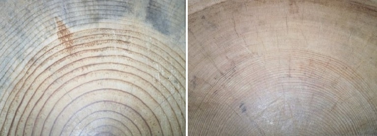 일반 소나무(왼쪽)와 춘양목(오른쪽) 나이테를 비교해 볼까요?