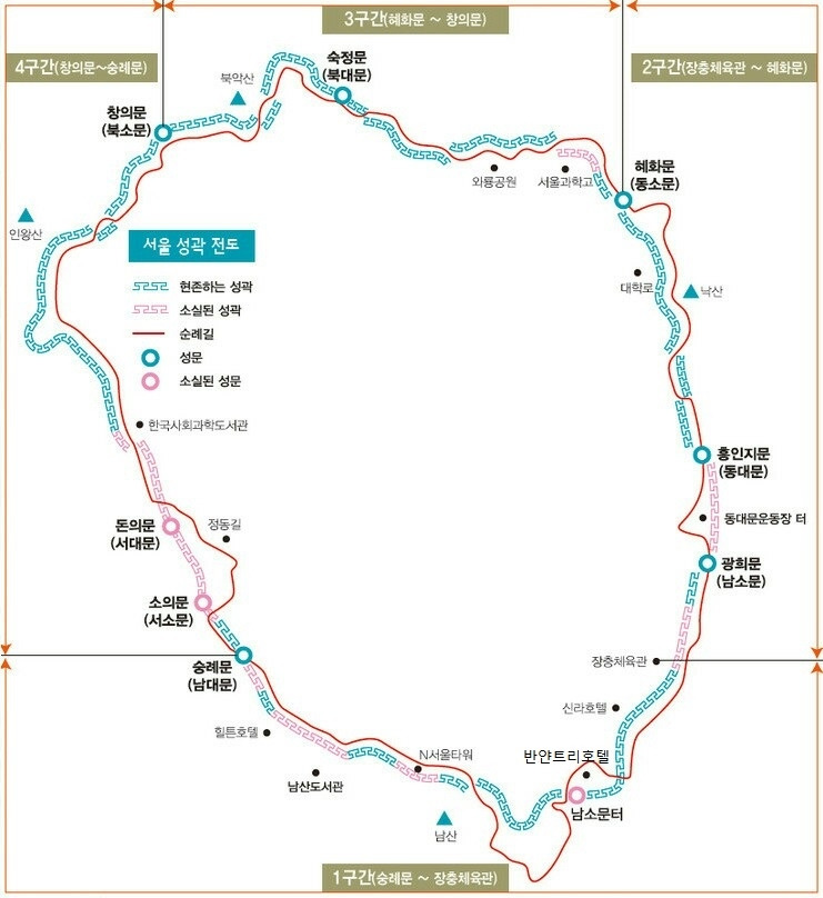 도성 답사는 한양을 둘러싼 내사산(內四山)을 중심으로, 인왕산구간(숭례문~창의문), 백악구간(창의문~혜화문), 낙산구간(혜화문~광희문), 남산구간(광희문~숭례문)으로 크게 나눌 수 있습니다. 숭례문 구간과 흥인지문 구간을 따로 빼서 6개 구간으로 나누기도 합니다만 일반적으로 숭례문 구간을 인왕산구간에, 흥인지문구간을 낙산구간에 포함시킵니다.